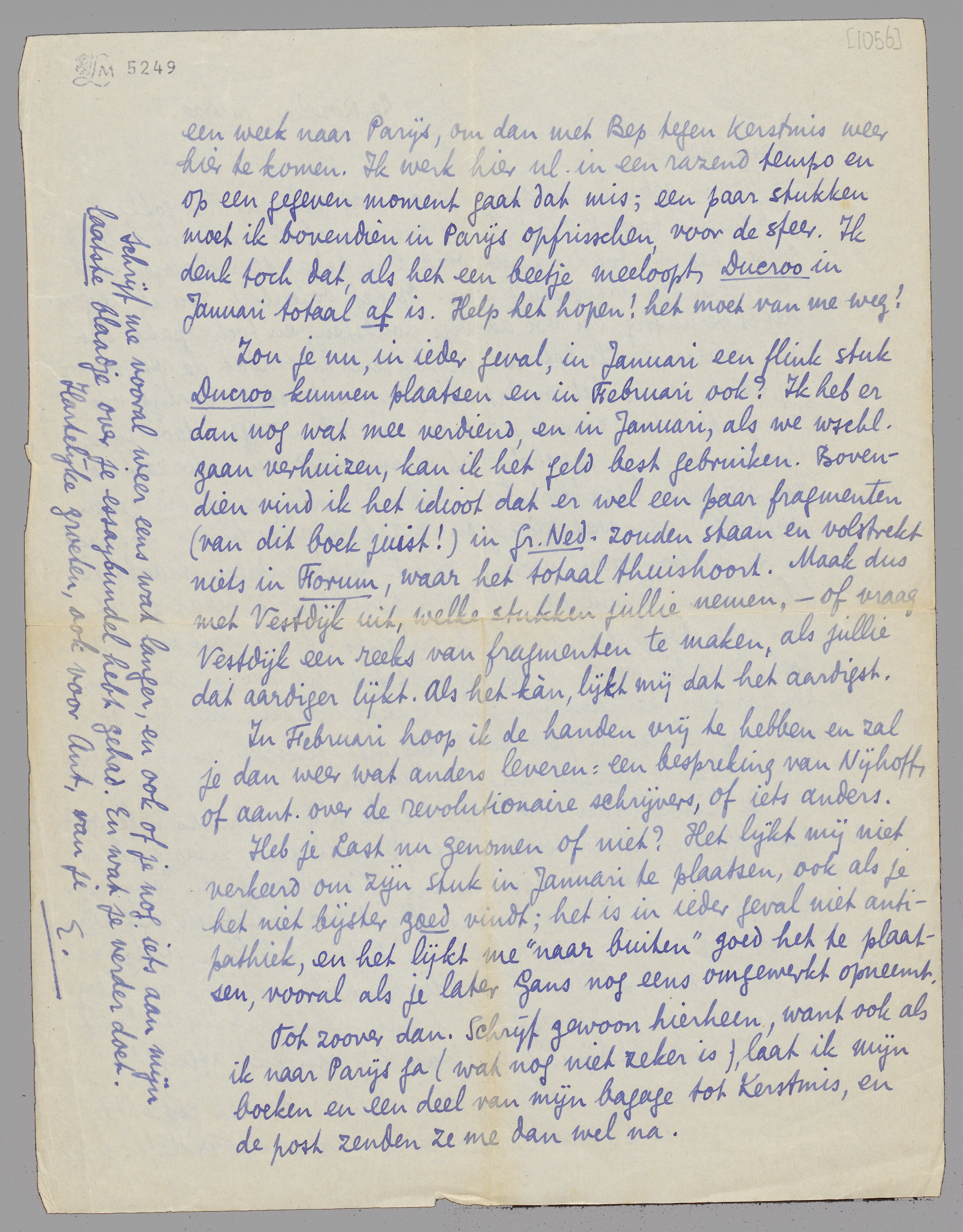 Zou je nu, in ieder geval, in Januari een flink stuk Ducroo kunnen plaatsen en in Februari ook? Ik heb er dan nog wat mee verdiend, en in Januari, als we wschl. gaan verhuizen, kan ik het geld best gebruiken. Bovendien vind ik het idioot dat er wel een paar fragmenten (van dit boek juist!) in Gr. Ned. zouden staan en volstrekt niets in Forum, waar het totaal thuishoort. Maak dus met Vestdijk uit, welke stukken jullie nemen, - of vraag Vestdijk een reeks van fragmenten te maken, als jullie dat aardiger lijkt. Als het kàn, lijkt mij dat het aardigst.