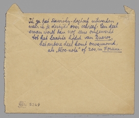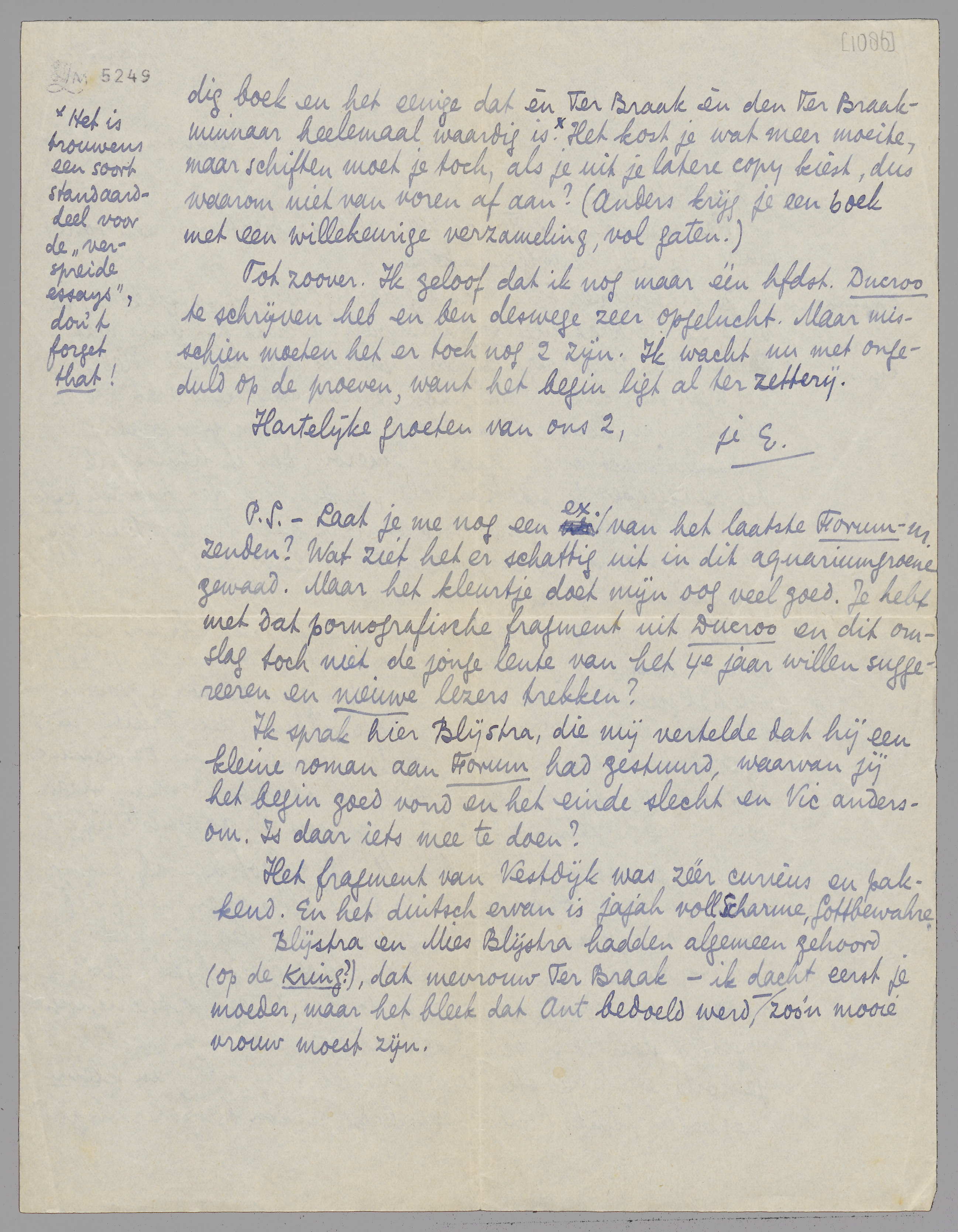 P.S. - Laat je me nog een ex. van het laatste Forum-nr. zenden? Wat ziet het er schattig uit in dit aquariumgroene gewaad. Maar het kleurtje doet mijn oog veel goed. Je hebt met dat pornografische fragment uit Ducroo en dit omslag toch niet de jonge lente van het 4e jaar willen suggereeren en nieuwe lezers trekken? Ik sprak hier Blijstra, die mij vertelde dat hij een kleine roman aan Forum had gestuurd, waarvan jij het begin goed vond en het einde slecht en Vic andersom. Is daar iets mee te doen?