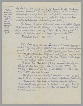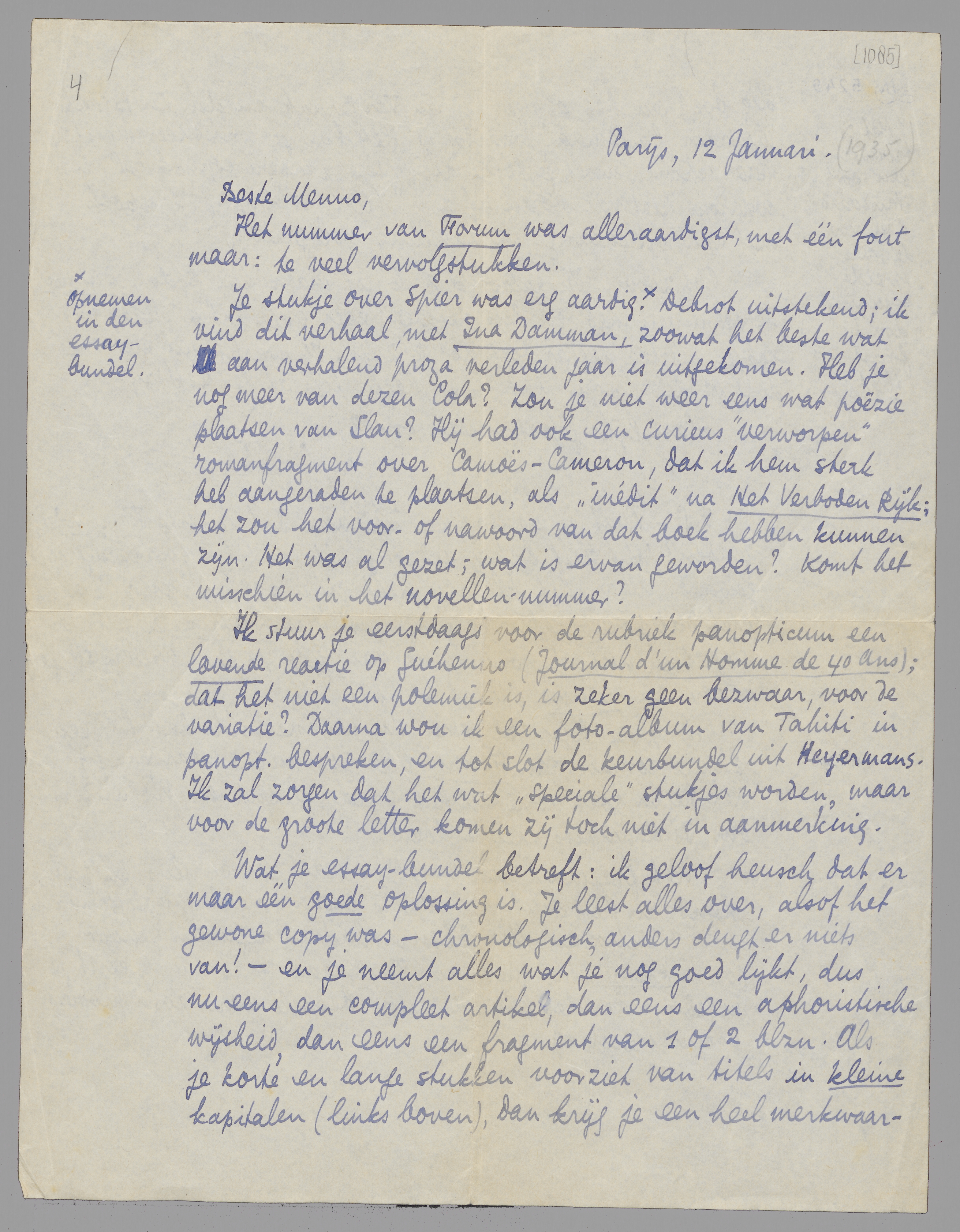 Ik stuur je eerstdaags voor de rubriek panopticum een lovende reactie op Guéhenno (Journal d'un Homme de 40 ans); dat het niet een polemiek is, is zeker geen bezwaar, voor de variatie? Daarna wou ik een foto-album van Tahiti in panopt. bespreken, en tot slot de keurbundel uit Heyermans. Ik zal zorgen dat het wat ‘speciale’ stukjes worden, maar voor de groote letter komen zij toch niet in aanmerking.