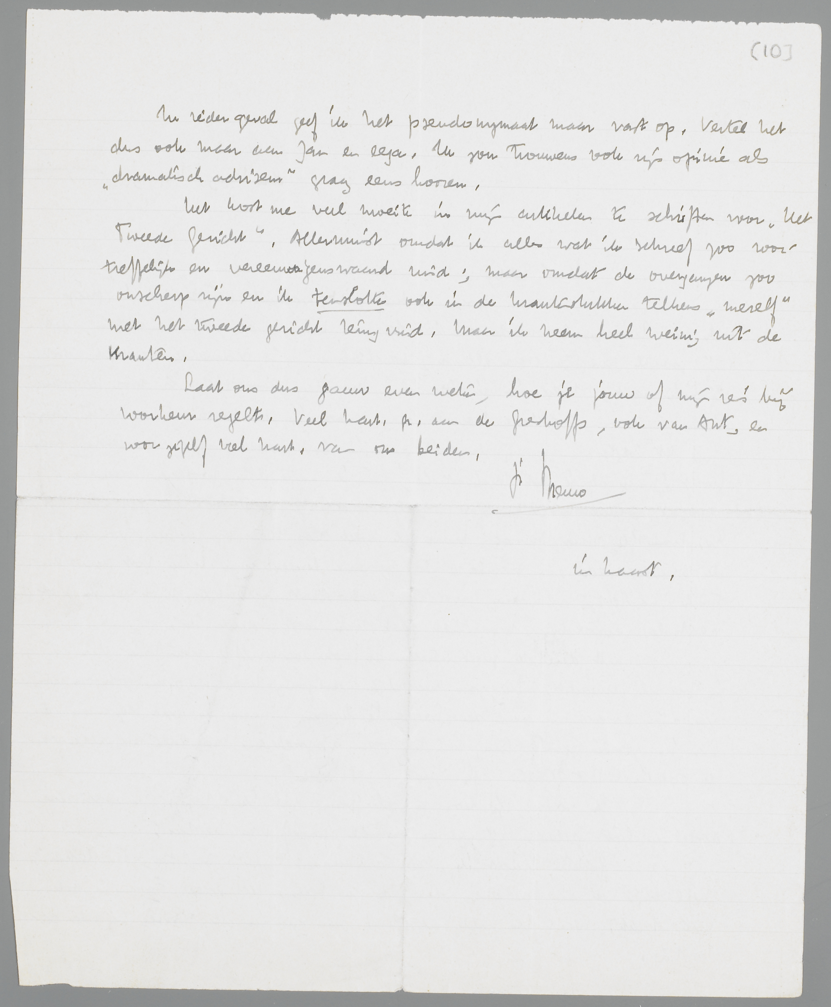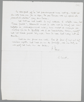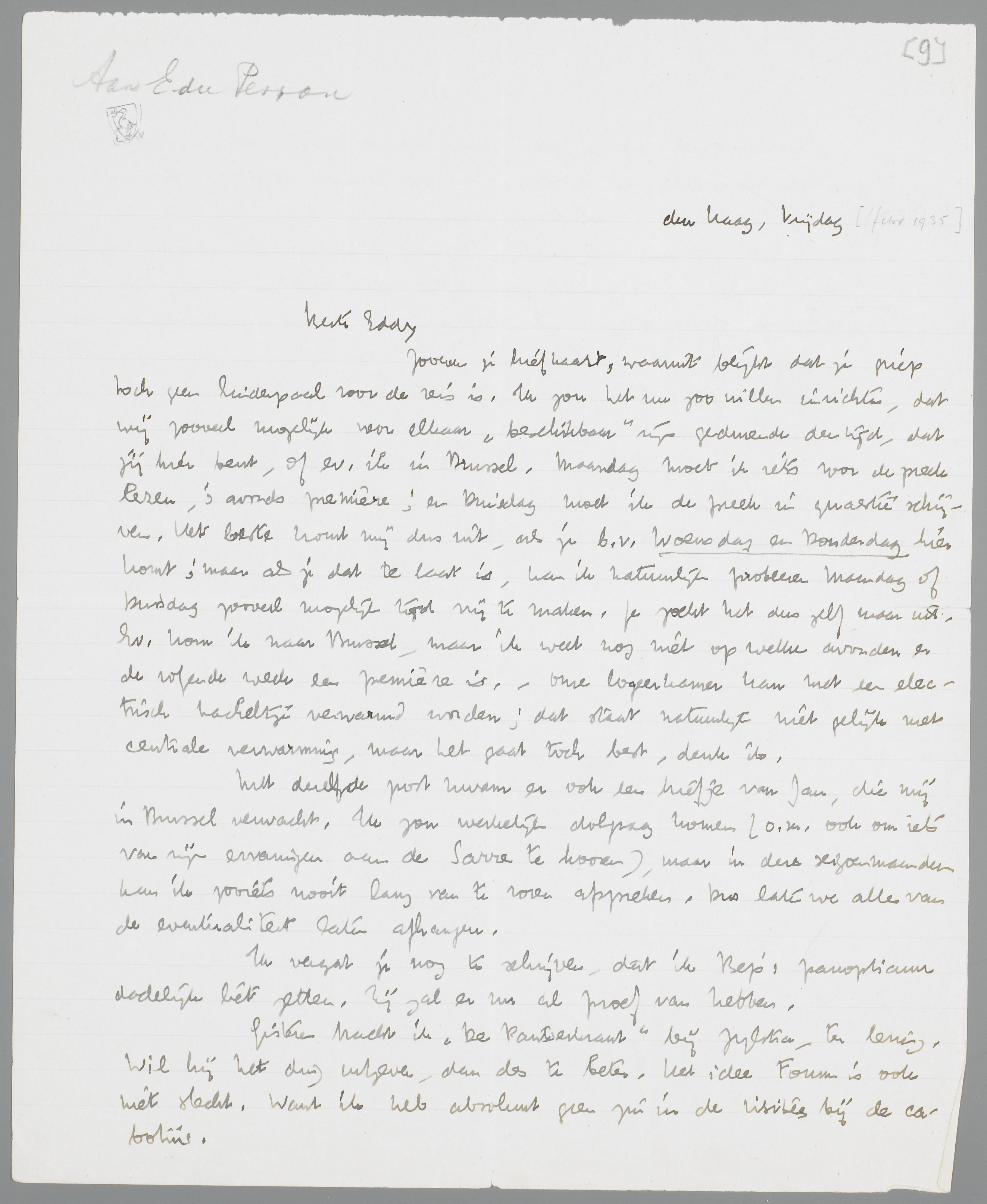 Zooeven je briefkaart, waaruit blijkt dat je griep toch geen hinderpaal voor de reis is. Ik zou het nu zoo willen inrichten, dat wij zooveel mogelijk voor elkaar ‘beschikbaar’ zijn gedurende den tijd, dat jij hier bent, of ev. ik in Brussel. Maandag moet ik iets voor de preek lezen, 's avonds première; en Dinsdag moet ik de preek in quaestie schrijven. Het beste komt mij dus uit, als je b.v. Woensdag en Donderdag hier komt; maar als je dat te laat is, kan ik natuurlijk probeeren Maandag of Dinsdag zoveel mogelijk tijd vrij te maken. Je zoekt het dus zelf maar uit. Ev. kom ik naar Brussel, maar ik weet nog niet op welke avonden er de volgende week een première is. - Onze logeerkamer kan met een electrisch kacheltje verwarmd worden; dat staat natuurlijk niet gelijk met centrale verwarming, maar het gaat toch best, denk ik.