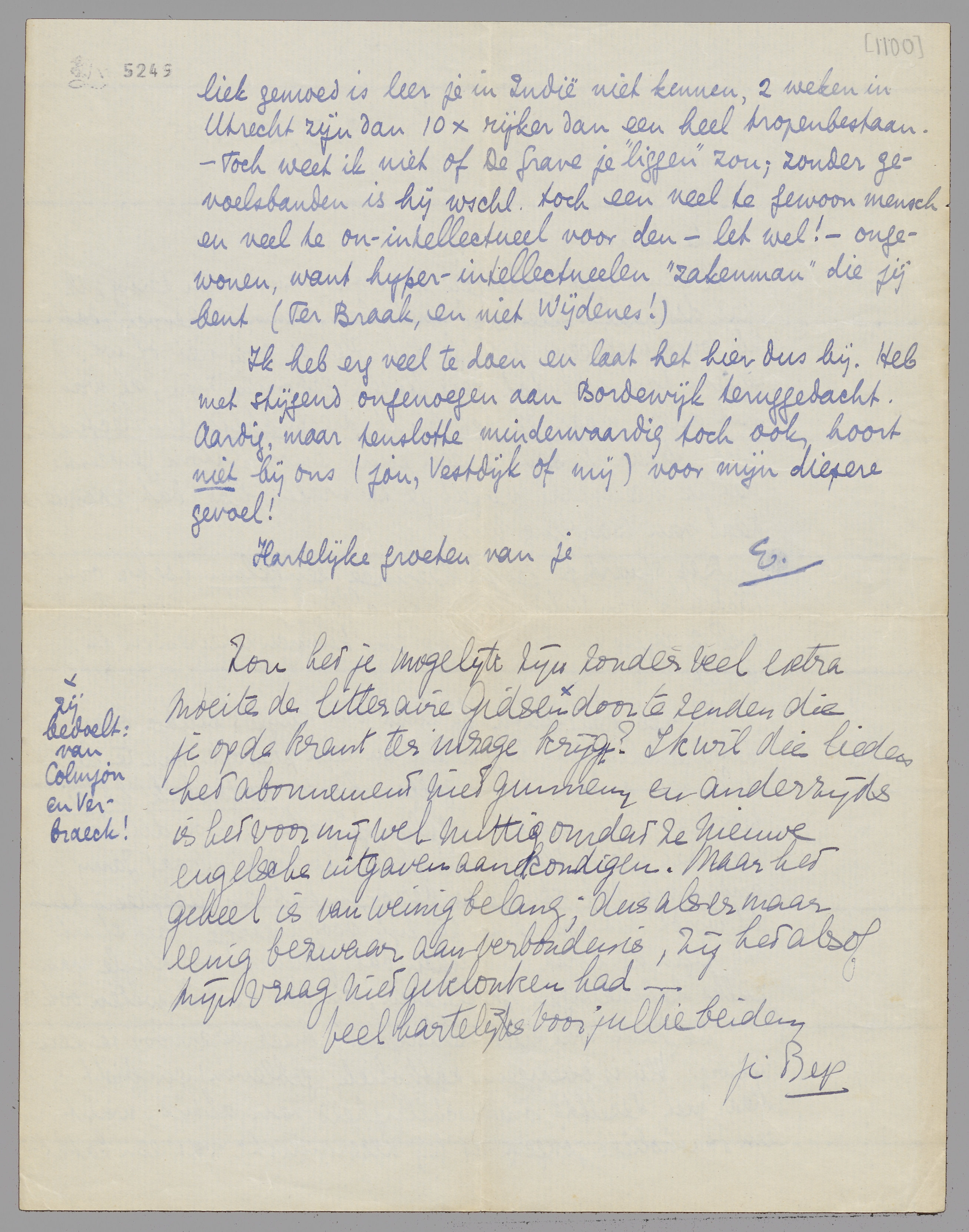 [E.d.P.-d.R.:] Zou het je mogelijk zijn zonder veel extra moeite de litteraire Gidsen* door te zenden die je op de krant ter inzage krijgt? Ik wil die lieden het abonnement niet gunnen en anderzijds is het voor mij wel nuttig omdat ze nieuwe engelsche uitgaven aankondigen. Maar het geheel is van weinig belang; dus als er maar eenig bezwaar aan verbonden is, zij het alsof mijn vraag niet geklonken had...