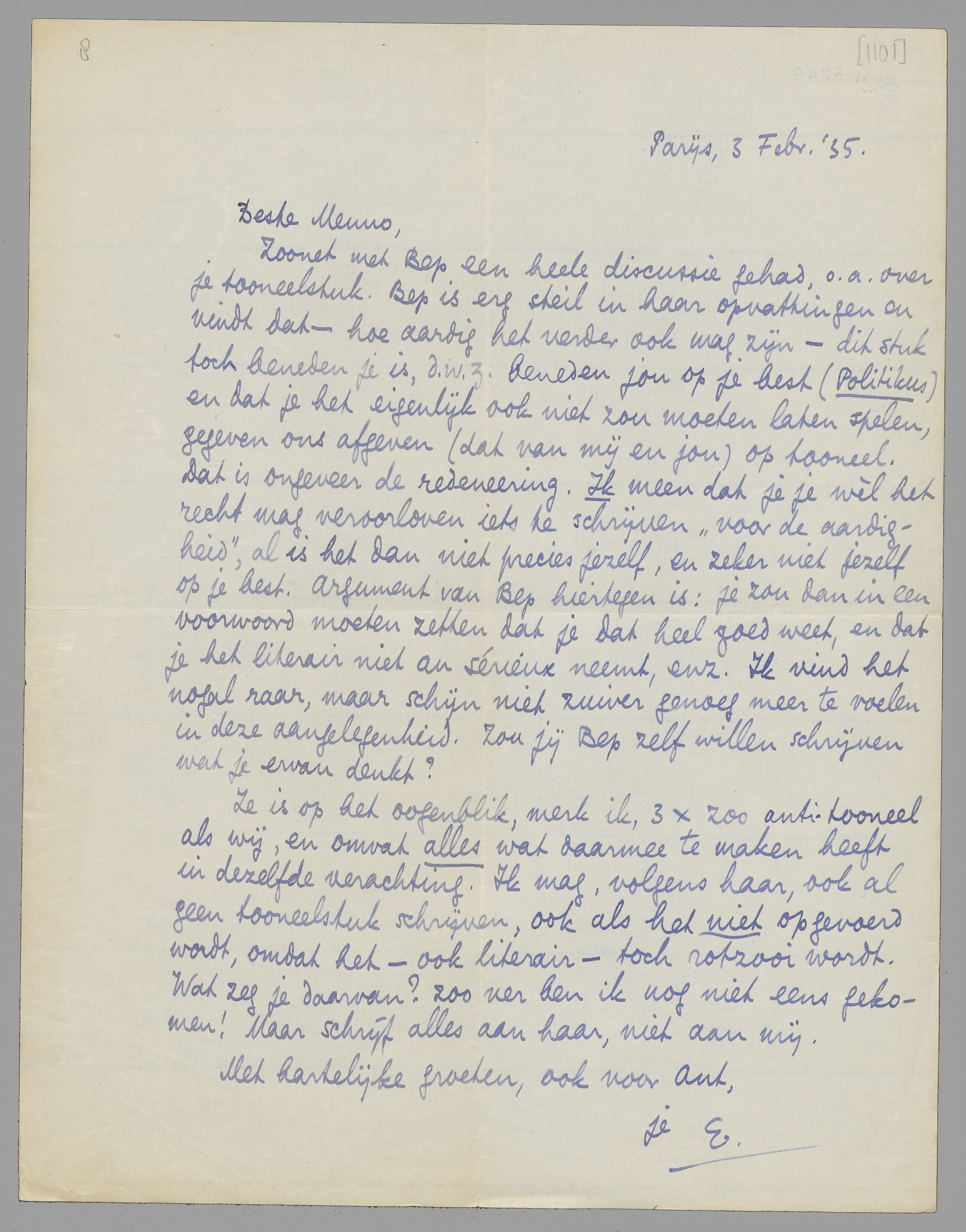 Zoonet met Bep een heele discussie gehad, o.a. over je tooneelstuk. Bep is erg steil in haar opvattingen en vindt dat - hoe aardig het verder ook mag zijn - dit stuk toch beneden je is, d.w.z. beneden jou op je best (Politikus) en dat je het eigenlijk ook niet zou moeten laten spelen, gegeven ons afgeven (dat van mij en jou) op tooneel. Dat is ongeveer de redeneering. Ik meen dat je je wèl het recht mag veroorloven iets te schrijven ‘voor de aardigheid’, al is het dan niet precies jezelf, en zeker niet jezelf op je best. Argument van Bep hiertegen is: je zou dan in een voorwoord moeten zetten dat je dat heel goed weet, en dat je het literair niet au sérieux neemt, enz. Ik vind het nogal raar, maar schijn niet zuiver genoeg meer te voelen in deze aangelegenheid. Zou jij Bep zelf willen schrijven wat je ervan denkt?