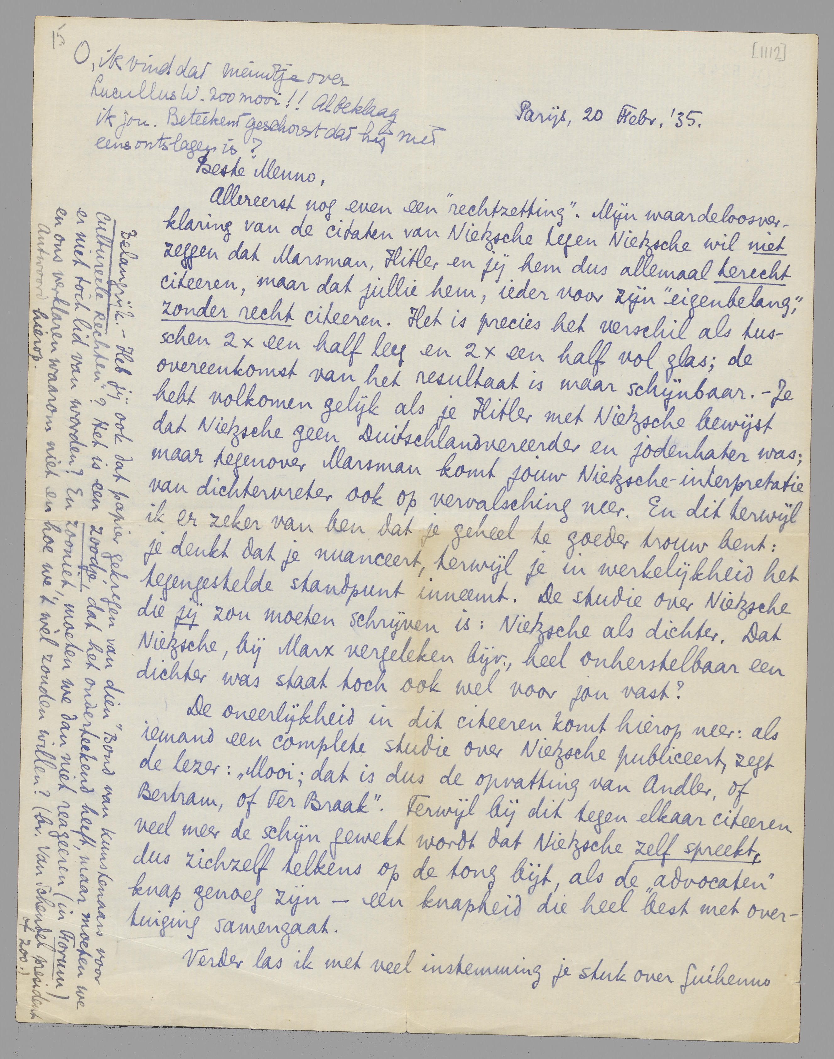Allereerst nog even een ‘rechtzetting’. Mijn waardeloosverklaring van de citaten van Nietzsche tegen Nietzsche wil niet zeggen dat Marsman, Hitler en jij hem dus allemaal terecht citeeren, maar dat jullie hem, ieder voor zijn ‘eigenbelang’, zonder recht citeeren. Het is precies het verschil als tusschen 2 × een half leeg en 2 × een half vol glas; de overeenkomst van het resultaat is maar schijnbaar. - Je hebt volkomen gelijk als je Hitler met Nietzsche bewijst dat Nietzsche geen Duitschlandvereerder en jodenhater was; maar tegenover Marsman komt jouw Nietzsche interpretatie van dichtervreter ook op vervalsching neer. En dit terwijl ik er zeker van ben dat je geheel te goeder trouw bent: je denkt dat je nuanceert, terwijl je in werkelijkheid het tegenstelde standpunt inneemt. De studie over Nietzsche die jij zou moeten schrijven is: Nietzsche als dichter. Dat Nietzsche, bij Marx vergeleken bv., heel onherstelbaar een dichter was staat toch ook wel voor jou vast?
