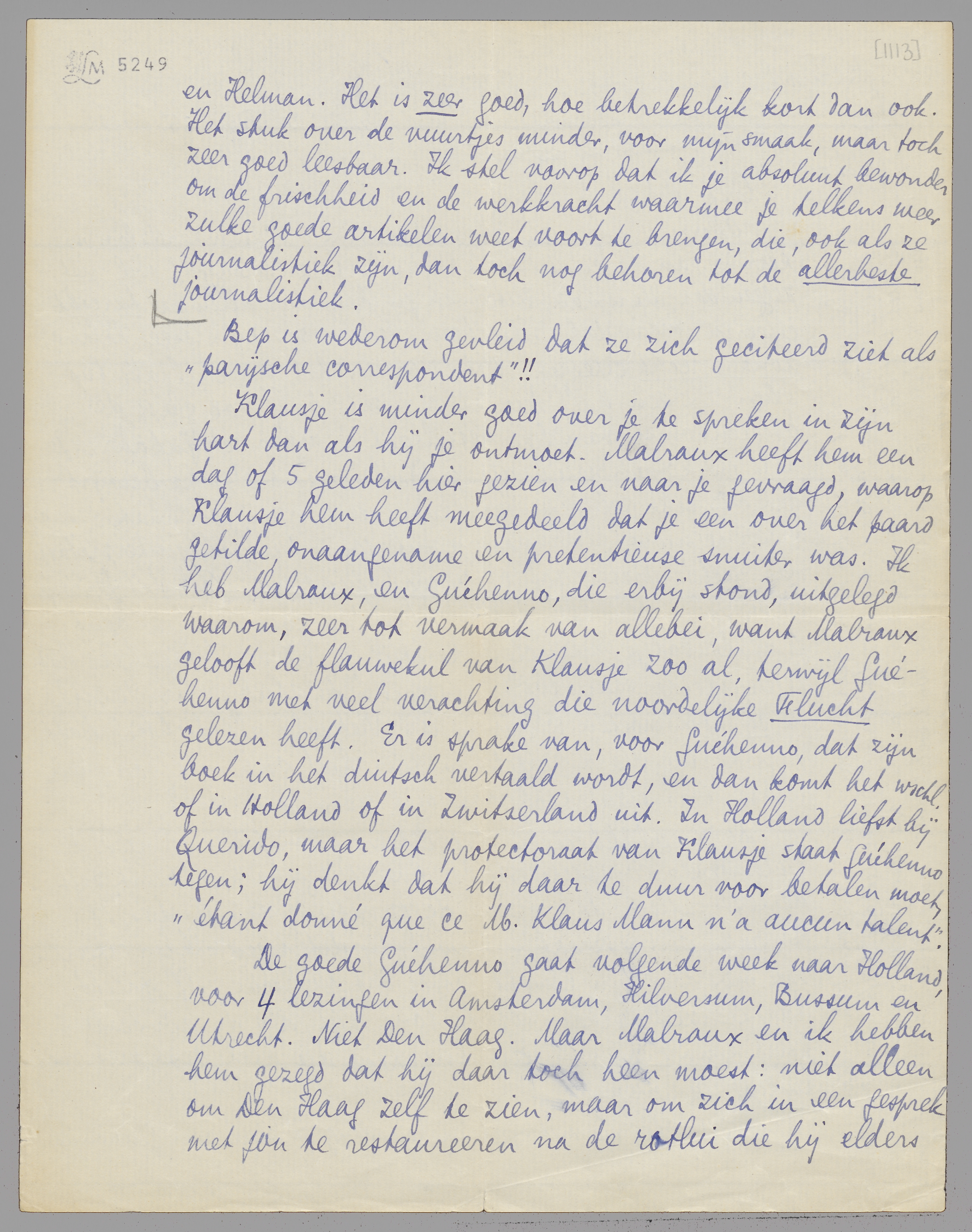 Klausje is minder goed over je te spreken in zijn hart dan als hij je ontmoet. Malraux heeft hem een dag of 5 geleden hier gezien en naar je gevraagd, waarop Klausje hem heeft meegedeeld dat je een over het paard getilde, onaangename en pretentieuse snuiter was. Ik heb Malraux, en Guéhenno, die erbij stond, uitgelegd waarom, zeer tot vermaak van allebei, want Malraux gelooft de flauwekul van Klausje zoo al, terwijl Guéhenno met veel verachting die noordelijke Flucht gelezen heeft. Er is sprake van, voor Guéhenno, dat zijn boek in het duitsch vertaald wordt en dan komt het wschl. of in Holland of in Zwitserland uit. In Holland liefst bij Querido, maar het protectoraat van Klausje staat Guéhenno tegen; hij denkt dat hij daar te duur voor betalen moet, ‘étant donné que ce M. Klaus Mann n'a aucun talent’.