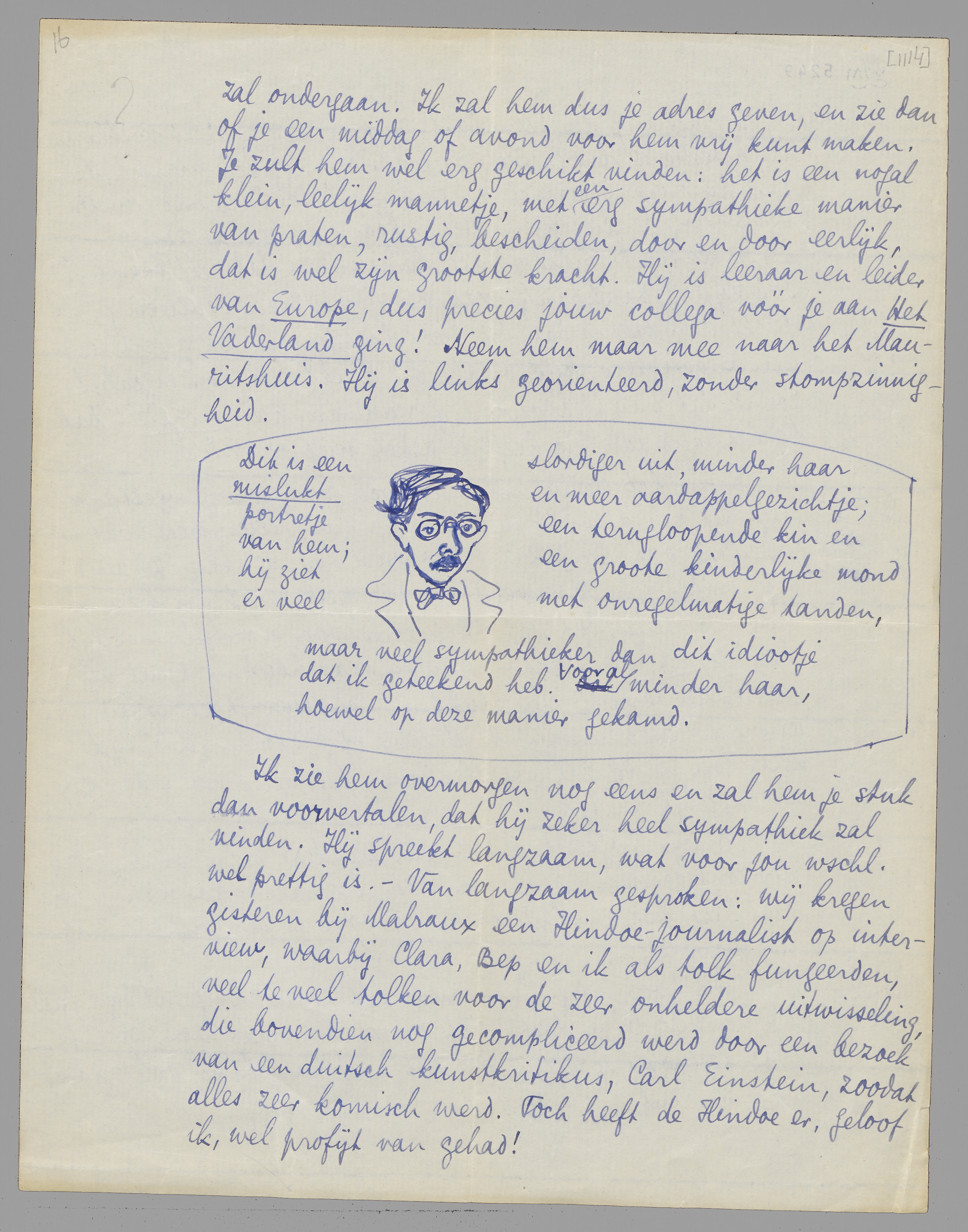 Je zult hem wel erg geschikt vinden: het is een nogal klein, leelijk mannetje, met een erg sympathieke manier van praten, rustig, bescheiden, door en door eerlijk, dat is wel zijn grootste kracht. Hij is leeraar en leider van Europe, dus precies jouw collega vóór je aan Het Vaderland ging! Neem hem maar mee naar het Mauritshuis. Hij is links georienteerd, zonder stompzinnigheid. [Dit is een mislukt portretje van hem; hij ziet er veel slordiger uit, minder haar en meer aardappelgezichtje; een terugloopende kin en een groote kinderlijke mond met onregelmatige tanden, maar veel sympathieker dan dit idiootje dat ik geteekend heb. Vooral minder haar, hoewel op deze manier gekamd.]
