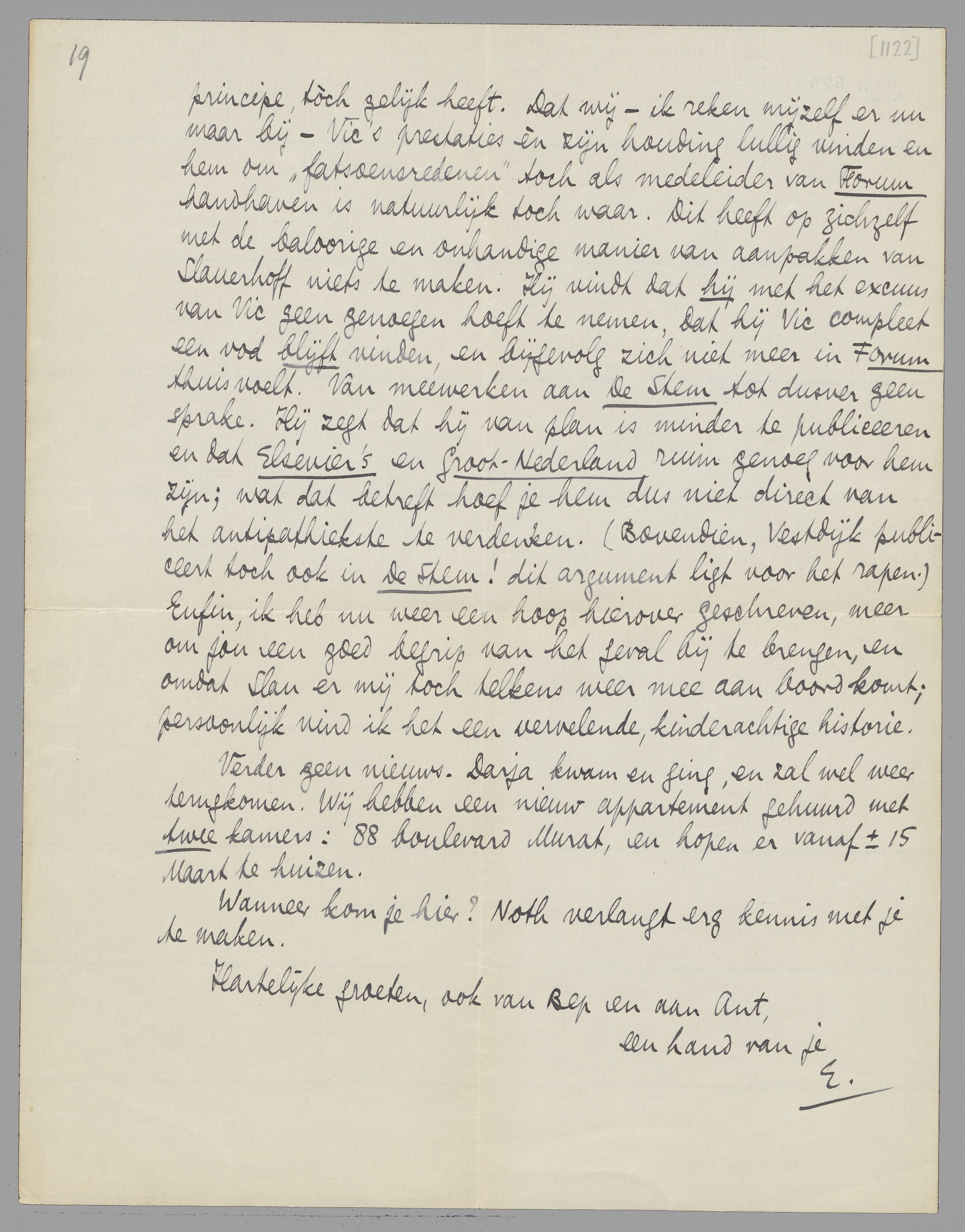Met Slau heb ik het weer bijgelegd, ofschoon het ware plezier er nu toch af is, en hij me ‘onderin’ voortdurend op het systeem werkt. Ik denk trouwens dat hij niet minder grieven tegen mij heeft, me een slecht vriend vindt en nogal karakterloos in die Forum-affaire ook, enz. enz. Het kan me weinig schelen, maar de sfeer is niet prettig, vooral omdat hij er op schijnt te rekenen dat ik hèm nu voortdurend met al zijn klachten aan de borst zal nemen, nu ik van Ducroo bevallen ben. - Gisteravond was ik even bij hem en kreeg een onmogelijk geschrift te zien, waarin hij aan de redactie van Forum uitlegt dat hij niet langer wil meewerken, aangezien hij van Vriesland beschouwt als een charlatan, die door de anderen wordt beschut en mogelijk gemaakt, wat hem in strijd lijkt met de principes over ‘persoonlijkheid’. Dit is op zichzelf lang niet onjuist, maar de brief was grotesk, hatelijk en plechtig tegelijk, de redactie wordt er met ‘gij’ in toegesproken, enz. Antonini heeft hem sterk afgeraden het epistel te verzenden, ik zeer matig: ik kàn hem niet zeggen ‘doe het niet’, als hij denkt zoo ontzettend vervaarlijk te zijn. Hij had ook weer erin gezet wat Vestdijk van Vic gezegd had, en dat ‘de groote medewerker du Perron zich over hem uitliet in termen die anders tegen ons aller tegenstander Coster gebezigd worden’, of zooiets. Ik heb hem niet eens gevraagd wat hij hiermee bedoelde; misschien ‘zwendel’ voor Vic's krantenkritiek, en ‘kringfluim’ voor zijn levenswandel. Het kan me ook niets meer verdommen. Als hij Antonini's raad opvolgt, zal hij jou persoonlijk schrijven, en in een andere stijl; maar misschien vindt hij dat te veel moeite en is dit proza zóó geslaagd voor zijn gevoel, dat hij dit toch verzendt. - Ik heb hem gezegd dat de ‘zuiverheid van Forum’ voor mij afgeloopen was na de bond met Vlaanderen, en dat ik sindsdien, evenals jij, Forum beschouw als een mogelijkheid méér tot publiceeren, en als zoodanig de meest dichtbije, maar hij schijnt dit ten eenenmale niet te begrijpen, en om de een of andere reden zijn manifestatie noodig te achten. Hij zal je dus ook vragen om in Het Vaderl. te zetten dat hij niet meer meewerkt en met de z.g. Forum-groep voortaan niets meer uitstaande heeft; en hij verwacht dan dat dit zonder commentaar gebeurt, omdat hij anders tot verdere onthullingen in staat is. Ik weet niet of je voor strijd voelt - ik zou het doen! - maar het verstandigste is zeker om van de heele zaak zoo min mogelijk notitie te nemen, vooral omdat Slauerhoff op sommige punten, in principe, tòch gelijk heeft. Dat wij - ik reken mijzelf er nu maar bij - Vic's prestaties èn zijn houding lullig vinden en hem om ‘fatsoensredenen’ toch als medeleider van Forum handhaven is natuurlijk toch waar. Dit heeft op zichzelf met de baloorige en onhandige manier van aanpakken van Slauerhoff niets te maken. Hij vindt dat hij met het excuus van Vic geen genoegen hoeft te nemen, dat hij Vic compleet een vod blijft vinden, en bijgevolg zich niet meer in Forum thuisvoelt. Van meewerken aan De Stem tot dusver geen sprake. Hij zegt dat hij van plan is minder te publiceeren en dat Elsevier's en Groot-Nederland ruim genoeg voor hem zijn; wat dat betreft hoef je hem dus niet direct van het antipathiekste te verdenken. (Bovendien, Vestdijk publiceert toch ook in De Stem! dit argument ligt voor het rapen.) Enfin, ik heb nu weer een hoop hierover geschreven, meer om jou een goed begrip van het geval bij te brengen, en omdat Slau er mij toch telkens weer mee aan boord komt; persoonlijk vind ik het een vervelende, kinderachtige historie.