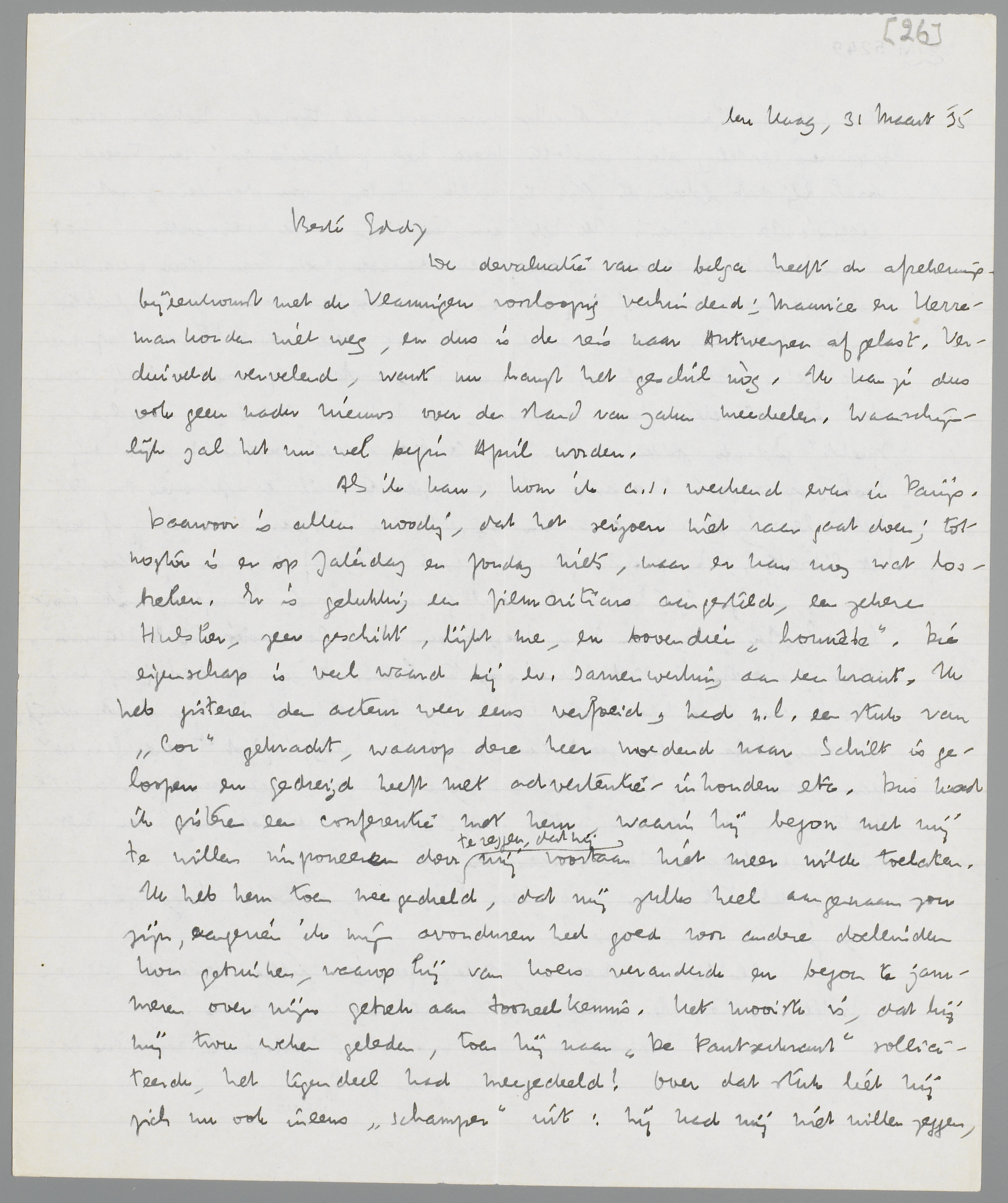 Als ik kan, kom ik a.s. weekend even in Parijs. Daarvoor is alleen noodig, dat het seizoen niet raar gaat doen; tot nog toe is er op Zaterdag en Zondag niets, maar er kan nog wat losbreken. Er is gelukkig een filmcriticus aangesteld, een zekere Hulsker, zeer geschikt, lijkt me, en bovendien ‘honnête’. Die eigenschap is veel waard bij ev. samenwerking aan de krant. Ik heb gisteren den acteur weer eens verfoeid, had n.l. een stuk van ‘Cor’ gekraakt, waarop deze heer woedend naar Schilt is geloopen en gedreigd heeft met advertentie-inhouden etc. Dus had ik gisteren een conferentie met hem waarin hij begon met mij te willen imponeeren door te zeggen, dat hij mij voortaan niet meer wilde toelaten. Ik heb hem toen meegedeeld, dat mij zulks heel aangenaam zou zijn, aangezien ik mijn avonduren heel goed voor andere doeleinden kan gebruiken, waarop hij van koers veranderde en begon te jammeren over mijn gebrek aan tooneelkennis. Het mooiste is, dat hij mij twee weken geleden, toen hij naar De Pantserkrant solliciteerde, het tegendeel had meegedeeld! Over dat stuk liet hij zich nu ook ineens ‘schamper’ uit: hij had mij niet willen zeggen, dat het eigenlijk nog niet rijp voor het tooneel was, het was een typische eersteling etc. Ten- slotte bleek het palurkje mij een tweede maal bij dat gekraakte stuk te willen halen, om dan een gunstige recensie te schrijven! Ik heb hem toen mijn volle verachting in het smoelement gespogen en zag hem daarop wèèr van kleur veranderen. Het eind was, dat hij mij groen van narigheid over zijn mislukte zitting, uitliet. Het opmerkelijkst is, dat deze soort fluimen op niets zoo weinig rekent als op een paar ongezouten opdonders; zij meenen, dat hun directeurschap en hun ‘ik heb al 35 jaar tooneel gespeeld’ indruk zullen maken! 's Avonds mij verfrischt door bij Bob op bezoek te gaan, die een operette wil componeeren om uit het clearing baantje te komen en mij nu om een scenario (of heet het libretto?) heeft gevraagd. Ik weet niet, of ik daar kans toe zie!