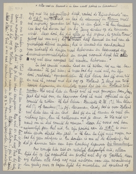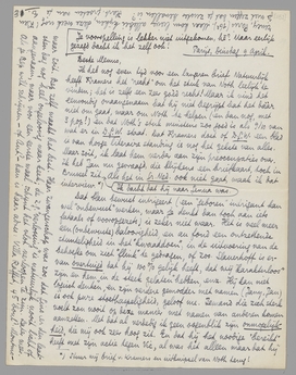 Ik heb nog even tijd voor een langeren brief. Natuurlijk heeft Kramers het ‘recht’ om het stuk van Noth leelijk te vinden; het is zelfs een zeer goèd recht! Maar ik vind het eenvoudig onaangenaam dat hij niet begrijpt dat het dààr niet om gaat, maar om Noth te helpen (en dan nog, met 3 pop!) en dat Noth's stuk minstens zoo goed is als 9/10 van wat er in D.G.W. staat. Dat Kramers doet of D.G.W. een blad is van hooge literaire standing is nog het gekste van alles. Maar soit, ik laat hem verder aan zijn preoccupaties over. Ik heb Jan nu gevraagd, die blijkens een briefkaart, toch in Brussel zit. Ik dacht dat hij naar Genua was. Als het in Gr. Ned. ook niet gaat, maak ik dat interview [Stuur mij brief van Kramers en uitknipsel van Noth terug!].