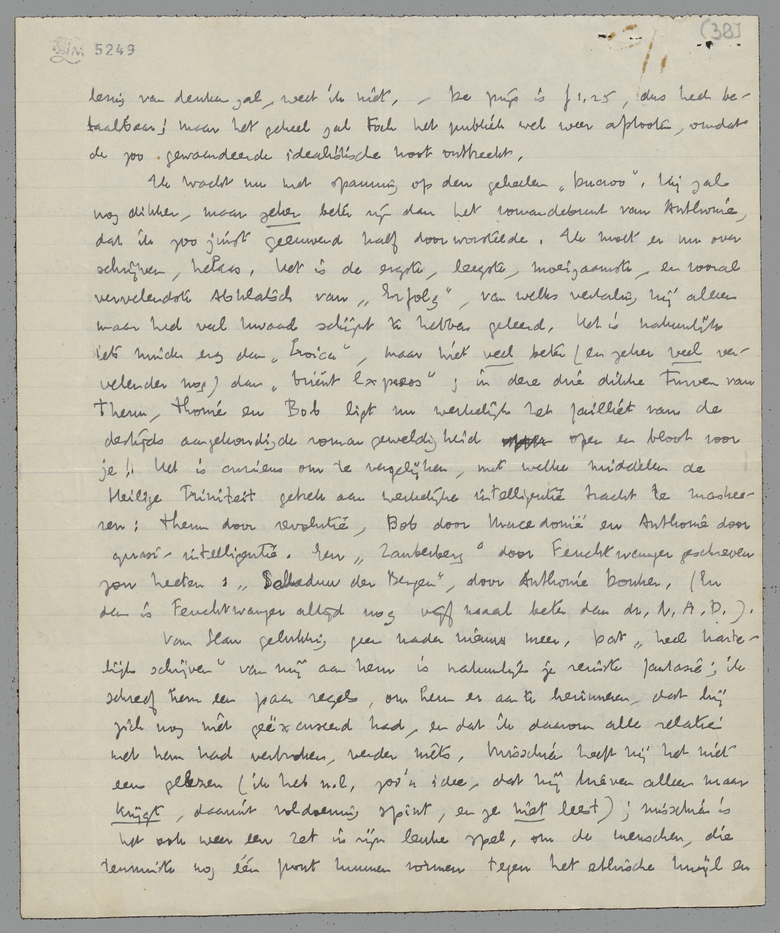 Ik wacht nu met spanning op den geheelen Ducroo. Hij zal nog dikker, maar zeker beter zijn dan het romandebuut van Anthoniet, dat ik zoojuist geeuwend half doorworstelde. Ik moet er nu over schrijven, helaas. Het is de ergste, leegste, moeizaamste, en vooral vervelendste Abklatsch van Erfolg, van welks vertaling hij alleen maar heel veel kwaad schijnt te hebben geleerd. Het is natuurlijk iets minder erg dan Eroïca, maar niet veel beter (en zeker veel vervelender nog) dan Oriënt Express; in deze drie dikke turven van Theun, Thonie en Bob ligt nu werkelijk het failliet van de destijds aangekondigde romangeweldigheid open en bloot voor je! Het is curieus om te vergelijken, met welke middelen de Heilige Triniteit gebrek aan werkelijke intelligentie tracht te maskeeren: Theun door revolutie, Bob door Macedonië en Anthonie door quasie-intelligentie. Een Zauberberg door Feuchtwanger geschreven zou heeten: Schaduw der Bergen, door Anthonie Donker. (En dan is Feuchtwanger altijd nog vijf maal beter dan Dr. N.A.D.).