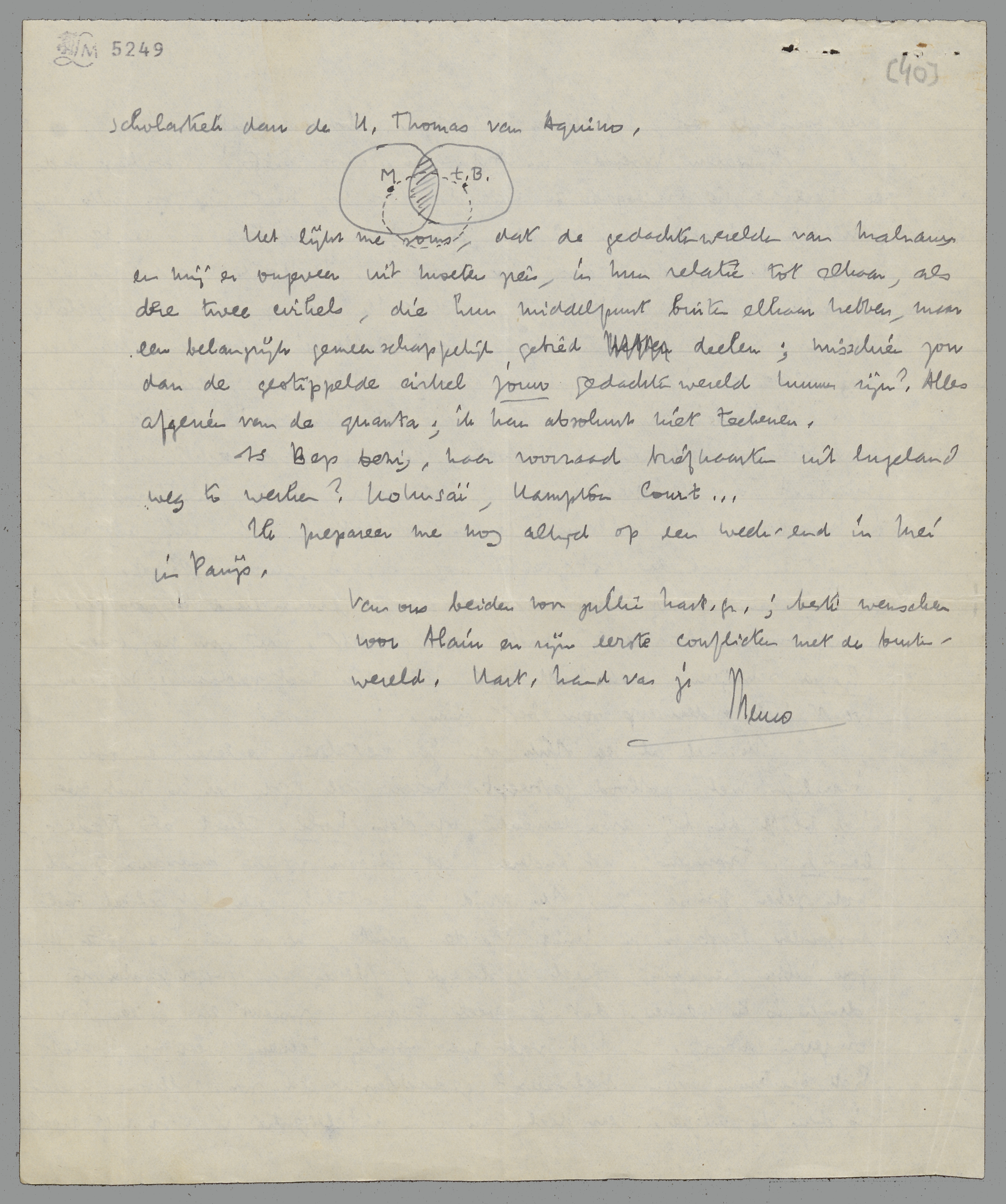 Het lijkt me soms, dat de gedachtenwereld van Malraux en mij er ongeveer uit moeten zien, in hun relatie tot elkaar, als deze twee cirkels, die hun middelpunt buiten elkaar hebben, maar een belangrijk gemeenschappelijk gebied deelen; misschien zou dan de gestippelde cirkel jouw gedachtenwereld kunnen zijn? Alles afgezien van de quanta; ik kan absoluut niet teekenen.