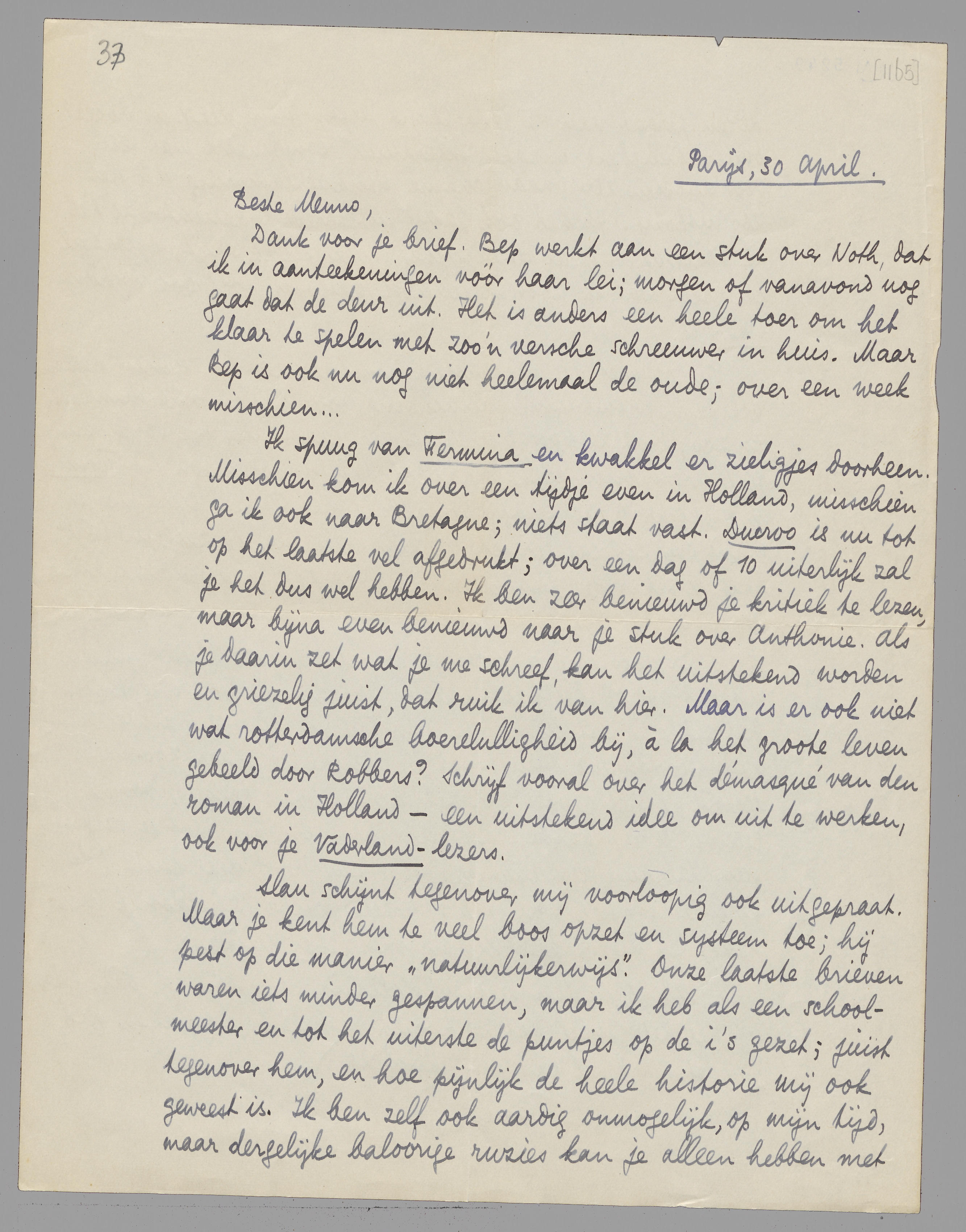 Ik spuug van Fermina en kwakkel er zieligjes doorheen. Misschien kom ik over een tijdje even in Holland, misschien ga ik ook naar Bretagne; niets staat vast. Ducroo is nu tot op het laatste vel afgedrukt; over een dag of 10 uiterlijk zal je het dus wel hebben. Ik ben zeer benieuwd je kritiek te lezen, maar bijna even benieuwd naar je stuk over Anthonie. Als je daarin zet wat je me schreef, kan het uitstekend worden en griezelig juist, dat ruik ik van hier. Maar is er ook niet wat rotterdamsche boerelulligheid bij, à la het groote leven gebeeld door Robbers? Schrijf vooral over het démasqué van den roman in Holland - een uitstekend idee om uit te werken, ook voor je Vaderland-lezers.