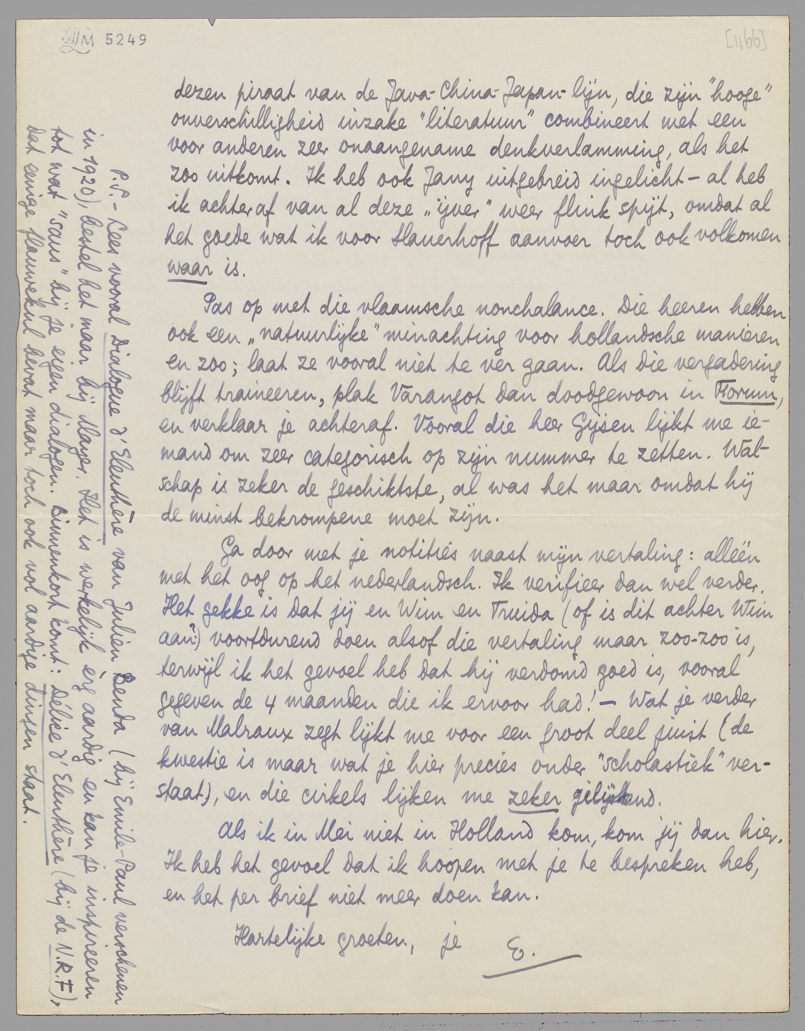 P.S. - Lees vooral Dialogue d'Eleuthère van Julien Benda (bij Emile-Paul verschenen in 1920), bestel het maar bij Mayer. Het is werkelijk èrg aardig en kan je inspireeren tot wat ‘saus’ bij je eigen dialogen. Binnenkort komt: Délice d'Eleuthère (bij de N.R.F.), dat eenige flauwekul bevat maar toch ook vol aardige dingen staat.