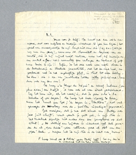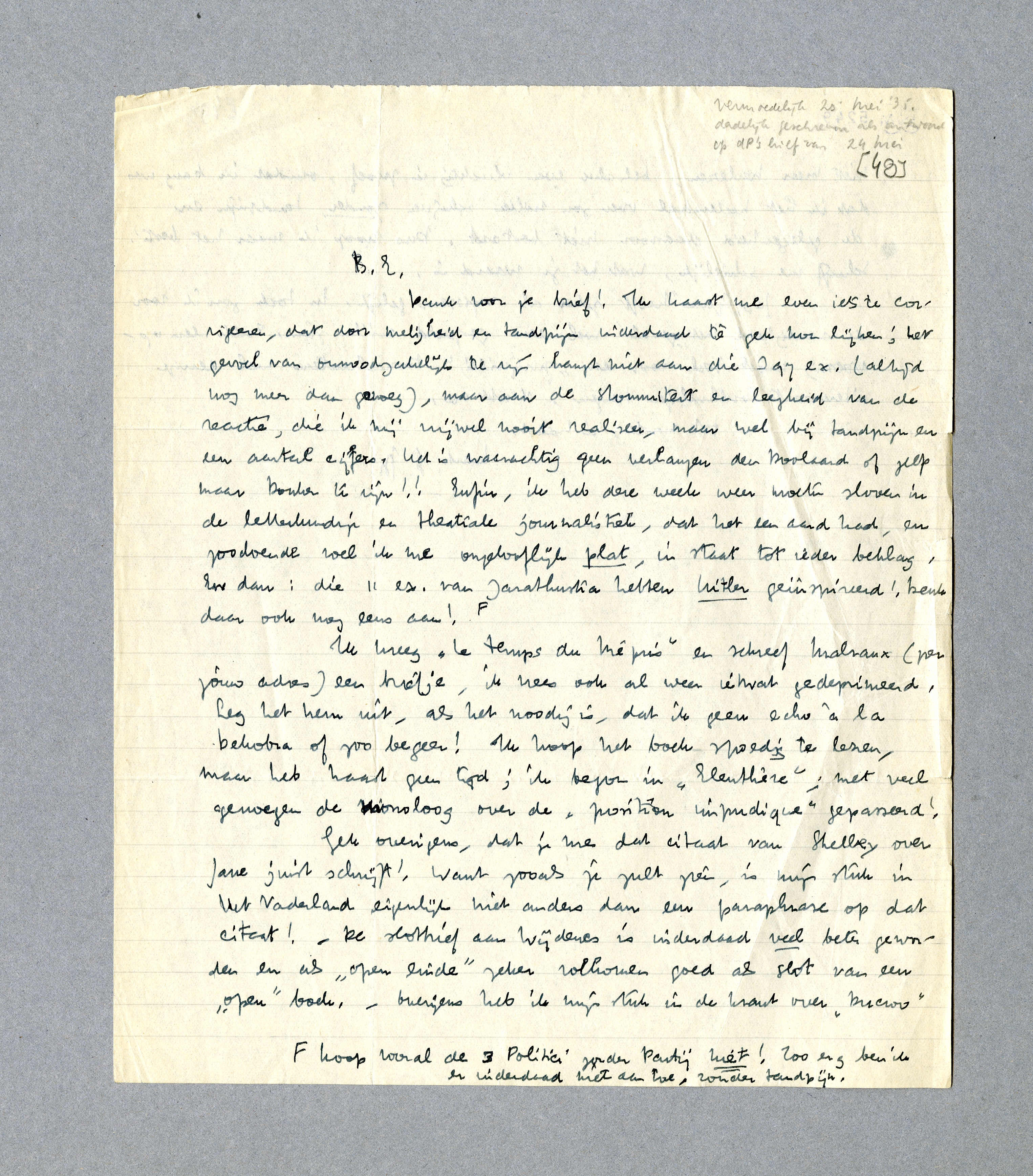 Ik kreeg Le temps du Mépris en schreef Malraux (per jouw adres) een briefje, ik vrees ook al weer ietwat gedeprimeerd. Leg het hem uit, als het noodig is, dat ik geen echo à la Dekobra of zoo begeer! Ik hoop het boek spoedig te lezen, maar heb haast geen tijd; ik begon in Eleuthère; met veel genoegen de monoloog over de ‘position impudique’ gepasseerd!
