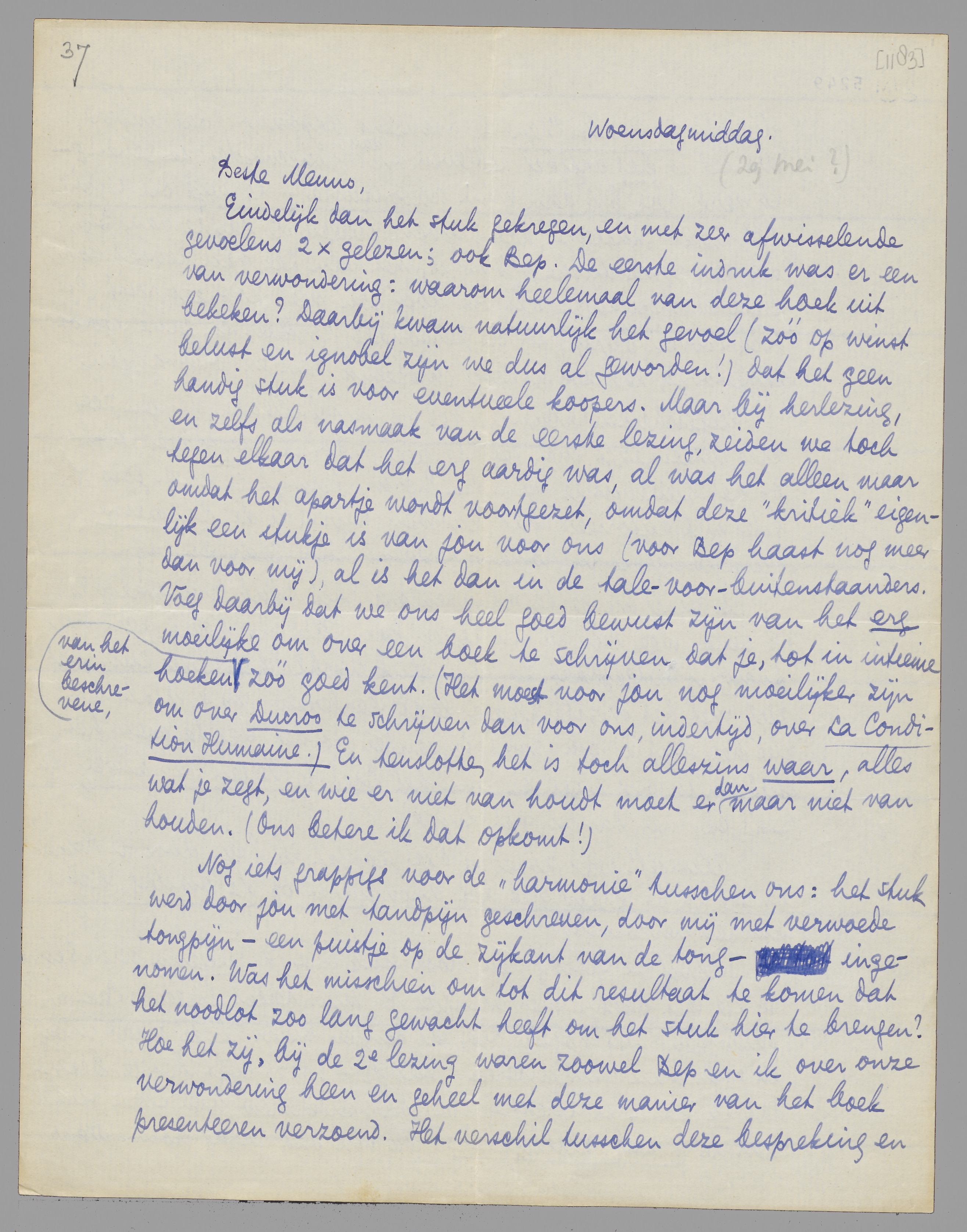 Eindelijk dan het stuk gekregen, en met zeer afwisselende gevoelens 2 × gelezen; ook Bep. De eerste indruk was er een van verwondering: waarom heelemaal van deze hoek uit bekeken? Daarbij kwam natuurlijk het gevoel (zóó op winst belust en ignobel zijn we dus al geworden!) dat het geen handig stuk is voor eventueele koopers. Maar bij herlezing, en zelfs als nasmaak van de eerste lezing, zeiden we toch tegen elkaar dat het erg aardig was, al was het alleen maar omdat het apartje wordt voortgezet, omdat deze ‘kritiek’ eigenlijk een stukje is van jou voor ons (voor Bep haast nog meer dan voor mij) al is het dan in de tale-voor-buitenstaanders. Voeg daarbij dat we ons heel goed bewust zijn van het erg moeilijke om over een boek te schrijven dat je, tot in intieme hoeken van het erin beschrevene, zóó goed kent. (Het moet voor jou nog moeilijker zijn om over Ducroo te schrijven dan voor ons, indertijd, over La Condition Humaine.) En tenslotte, het is toch alleszins waar, alles wat je zegt, en wie er niet van houdt moet er dan maar niet van houden. (Ons betere ik dat opkomt!)