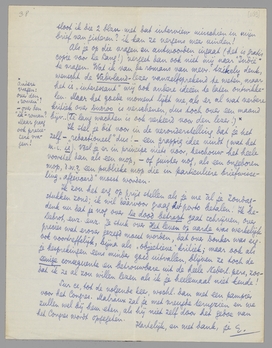 Nog iets grappigs voor de ‘harmonie’ tusschen ons: het stuk werd door jou met tandpijn geschreven, door mij met verwoede tongpijn - een puistje op de zijkant van de tong - ingenomen. Was het misschien om tot dit resultaat te komen dat het noodlot zoo lang gewacht heeft om het stuk hier te brengen? Hoe het zij, bij de 2e lezing waren zoowel Bep en ik over onze verwondering heen en geheel met deze manier van het boek presenteeren verzoend. Het verschil tusschen deze bespreking en die van De Smalle Mensch is overigens frappant: dat andere artikel is het artikel gebleven om aan oningewijden te geven - ik denk hier bv. aan mijn schoonzuster - terwijl dit wschl. het meest ‘intieme’ zal blijven. Alleen de tante van Bep, die een romantische vrouw is, met een zee van gevoel voor liefdesverhoudingen als die door jou met zooveel rust (en toch zooveel begrip) in de personages Arthur en Jane wordt aangetoond, zal zoo spoedig mogelijk een ex. ontvangen!