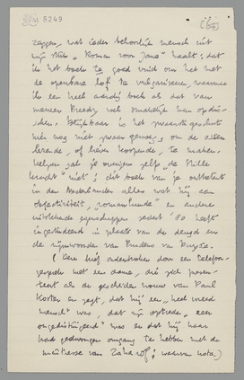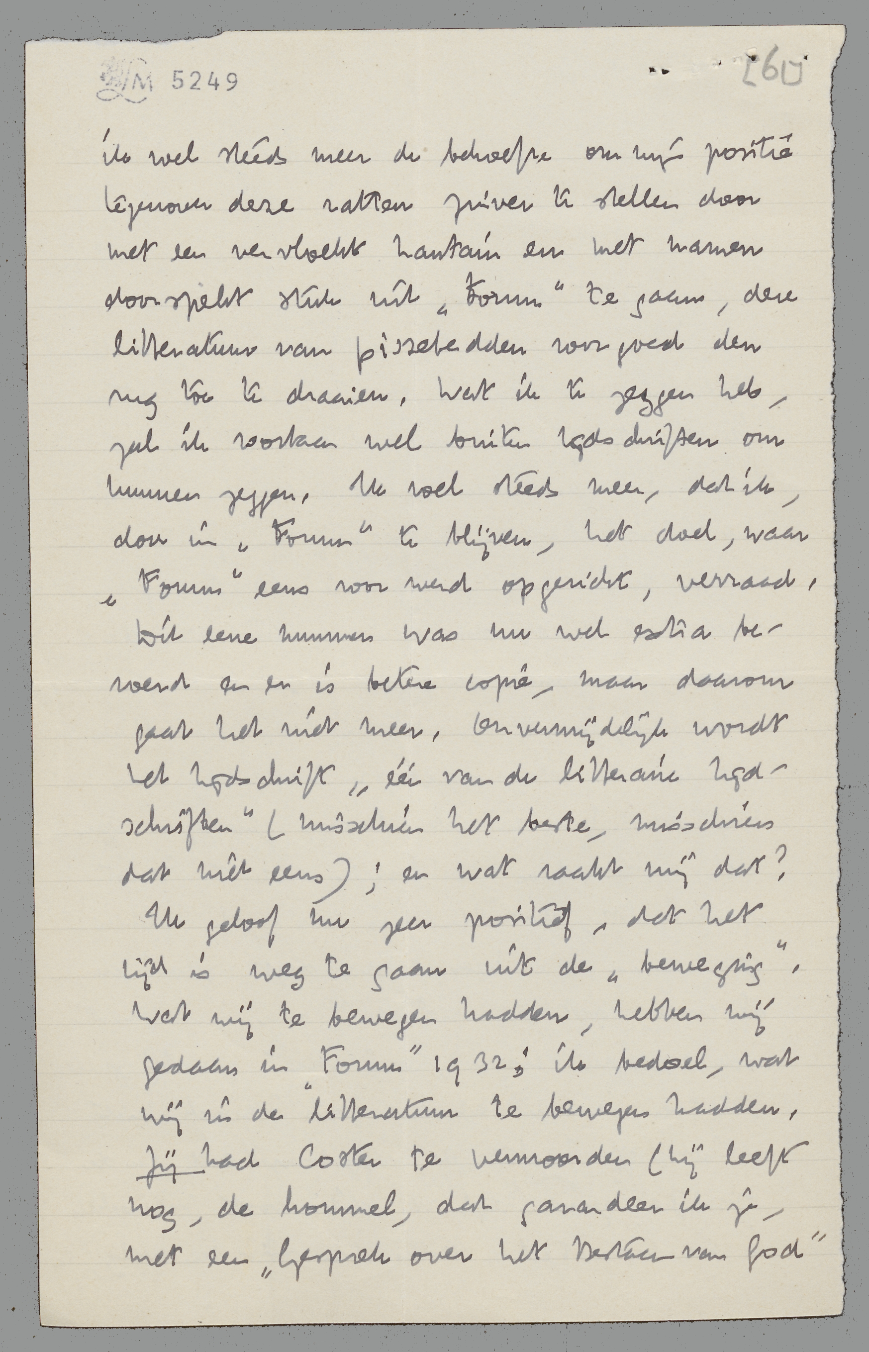Nu nog even het Congres. Ik hoop stellig te kunnen komen. Maar over de Ned. litteratuur praat ik zeker niet. Om redenen boven vermeld. Ik ontving van Malraux nog geen antwoord; maar het eenige punt, dat mij van essentieel belang zou lijken om (desgewenscht!) te behandelen, zou zijn de vrijheid. Ik ga Vrijdag naar Huizinga, zal hem aanporren, maar vrees, dat mijn advies hem eerder huiverig zal maken.