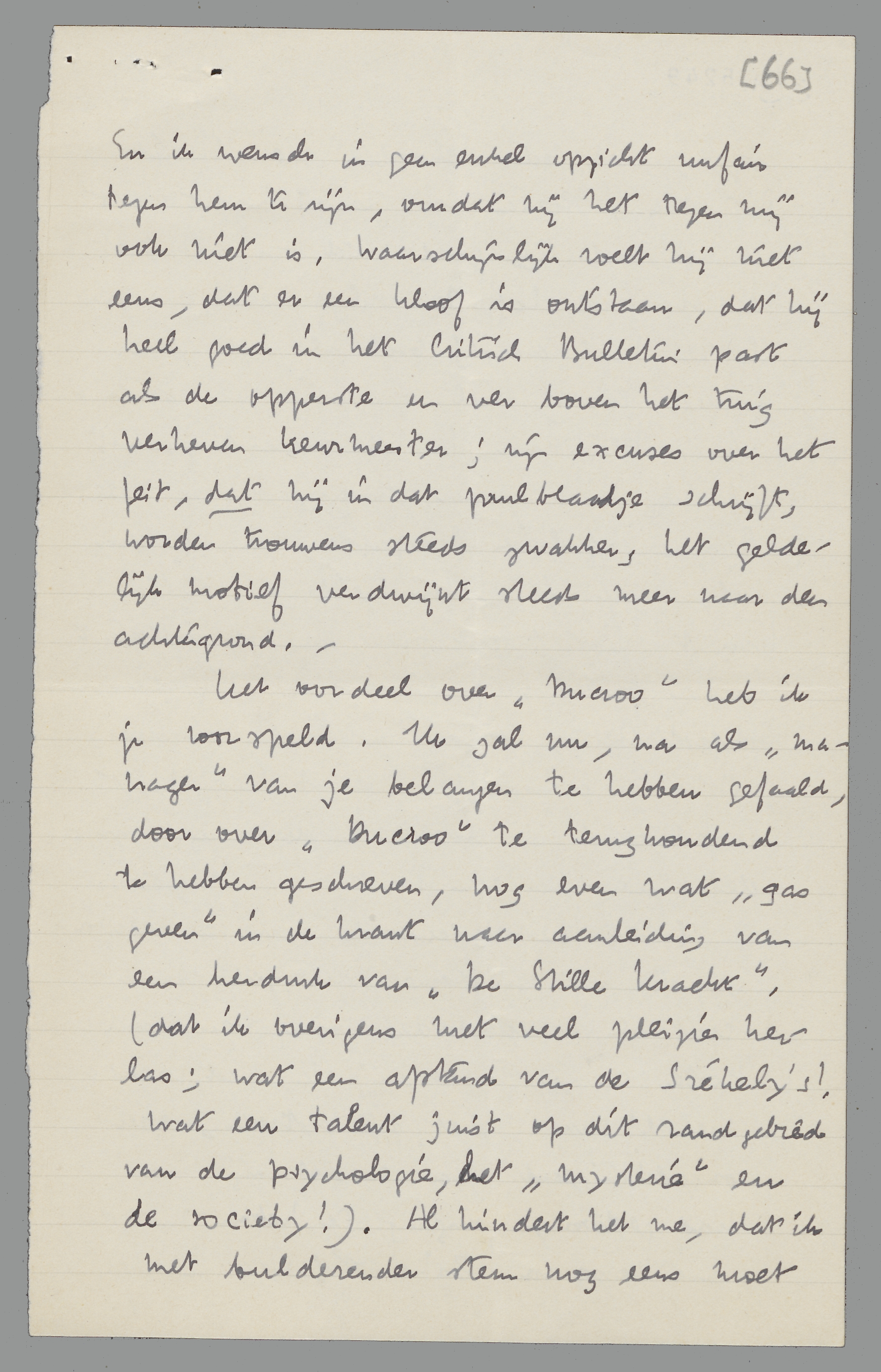 Het oordeel over Ducroo heb ik je voorspeld. Ik zal nu, na als ‘manager’ van je belangen te hebben gefaald, door over Ducroo te terughoudend te hebben geschreven, nog even wat ‘gas geven’ in de krant naar aanleiding van een herdruk van De Stille Kracht, (dat ik overigens met veel pleizier herlas; wat een afstand van de Székely's! Wat een talent juist op dit randgebied van de psychologie, het ‘mysterie’ en de society!). Al hindert het me, dat ik met bulderenden stem nog eens moet zeggen, wat ieder behoorlijk mensch uit mijn stuk Roman voor Jane haalt: dat ik het boek te goed vind om het met de openbare lof te vulgariseeren, waarmee ik een heel aardig boek als dat van meneer Preedy wel smakelijk kan opdisschen. Blijkbaar is het zwaarste geschut hier nog niet zwaar genoeg, om de ossen lezende, of liever koopende, te maken. Helpen zal je overigens zelfs de Stille Kracht niet; dit boek van je ontketent in den Nederlander alles wat hij aan objectiviteit, ‘romankunde’ en andere uitstekende eigenschappen sedert '80 heeft ingestudeerd in plaats van de deugd en de rijmwoorden van Prudens van Duyse.