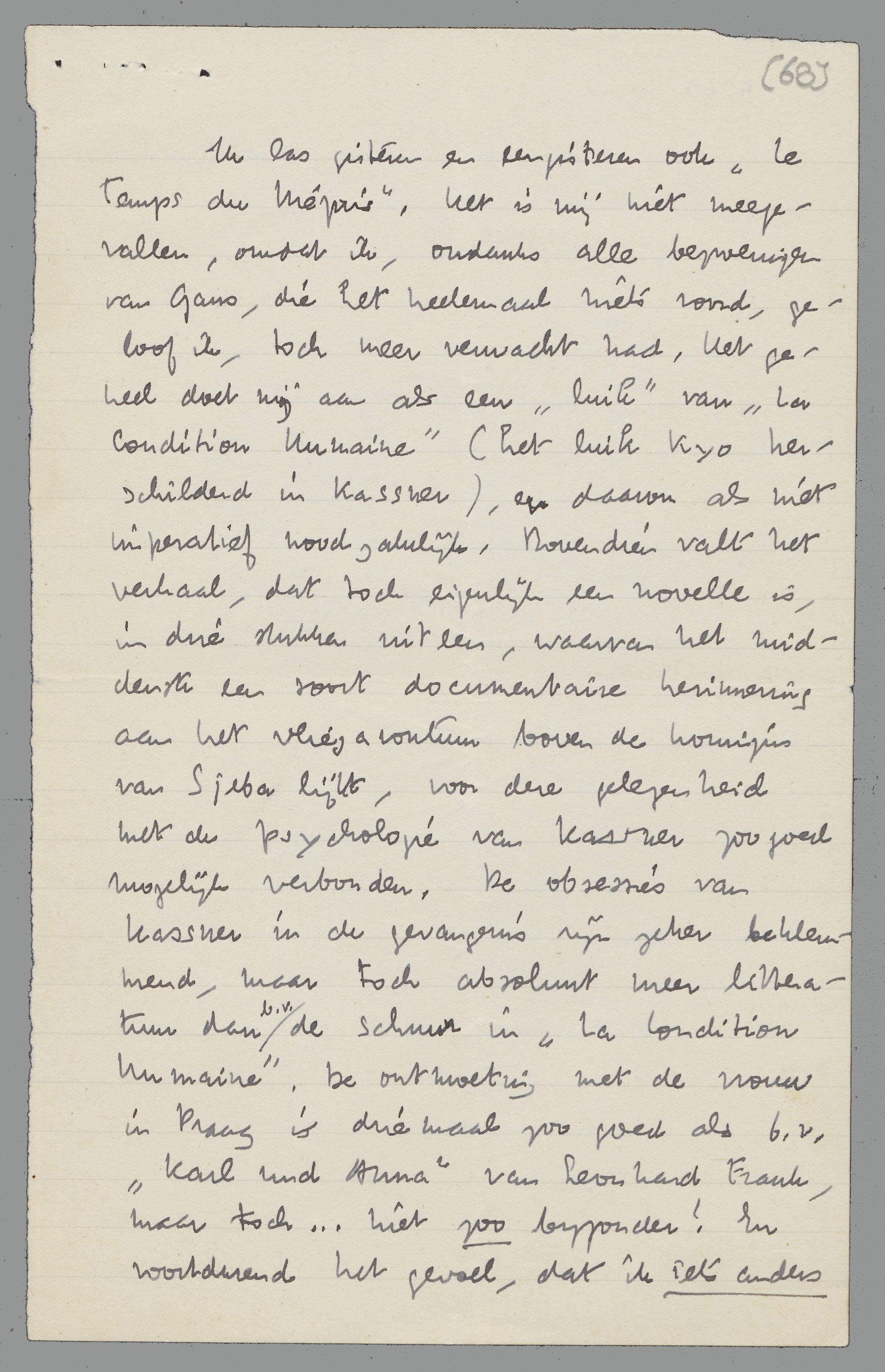 Ik las gisteren en eergisteren ook Le Temps du Mépris. Het is mij niet meegevallen, omdat ik, ondanks alle beweringen van Gans, die het heelemaal niets vond, geloof ik, toch meer verwacht had. Het geheel doet mij aan als een ‘luik’ van La Condition Humaine (het luik Kyo herschilderd in Kassner), en daarom als niet imperatief noodzakelijk. Bovendien valt het verhaal, dat toch eigenlijk een novelle is, in drie stukken uiteen, waarvan het middenste een soort documentaire herinnering aan het vliegavontuur boven de koningin van Sjeba lijkt, voor deze gelegenheid met de psychologie van Kassner zoo goed mogelijk verbonden. De obsessies van Kassner in de gevangenis zijn zeker beklemmend, maar toch absoluut meer litteratuur dan b.v. de schuur in La Condition Humaine. De ontmoeting met de vrouw in Praag is driemaal zoo goed als b.v. Karl und Anna van Leonhard Frank, maar toch... niet zoo bijzonder! En voortdurend het gevoel, dat ik iets anders verwacht had, dat dit ook niet het boek van de kameraden is, waaraan het is opgedragen. Maar het was zeker moeilijk, en allicht onmogelijk, vlak na La Condition Humaine iets te schrijven in denzelfden ‘adem’, dat er bij zou kunnen halen.