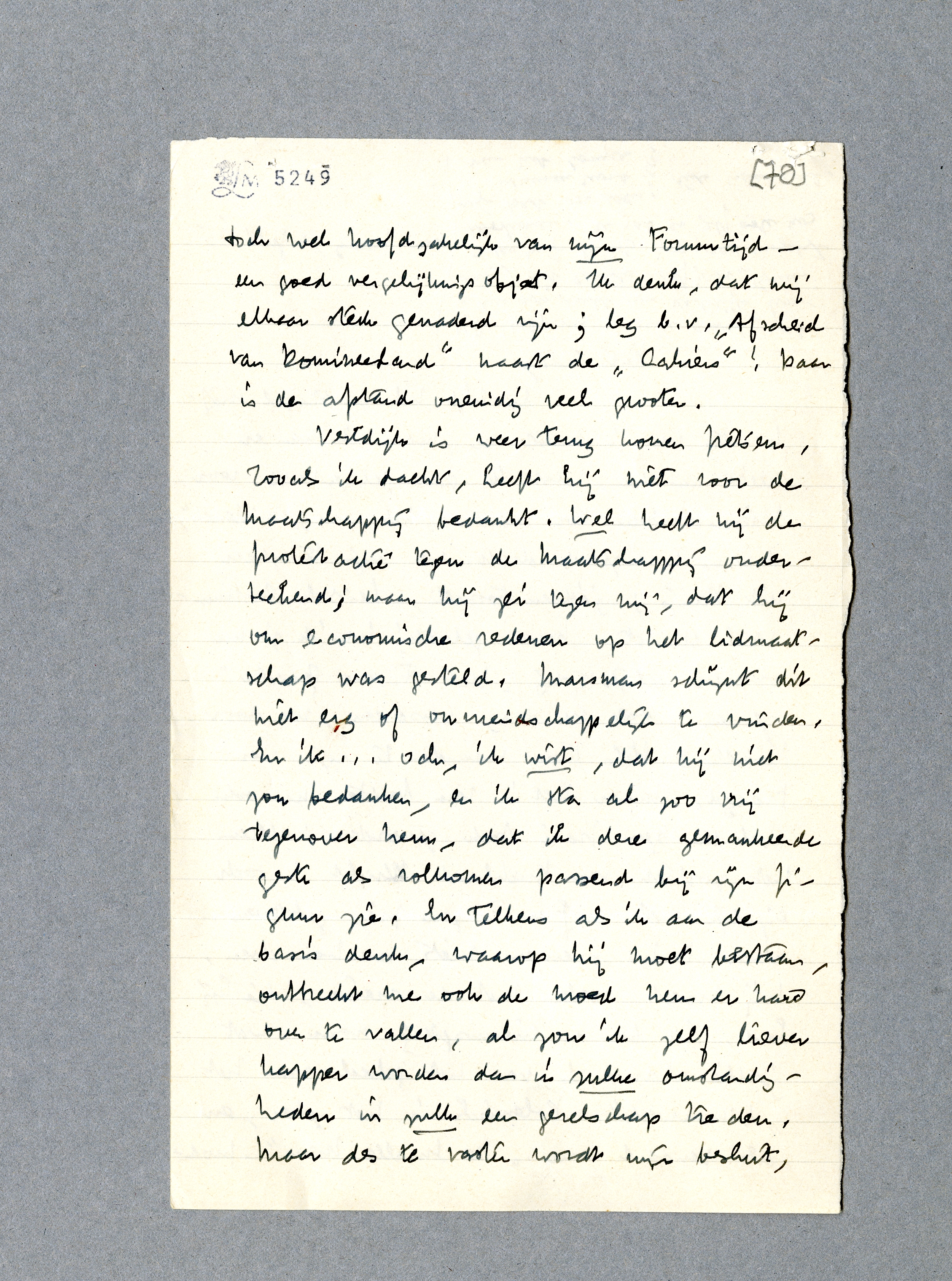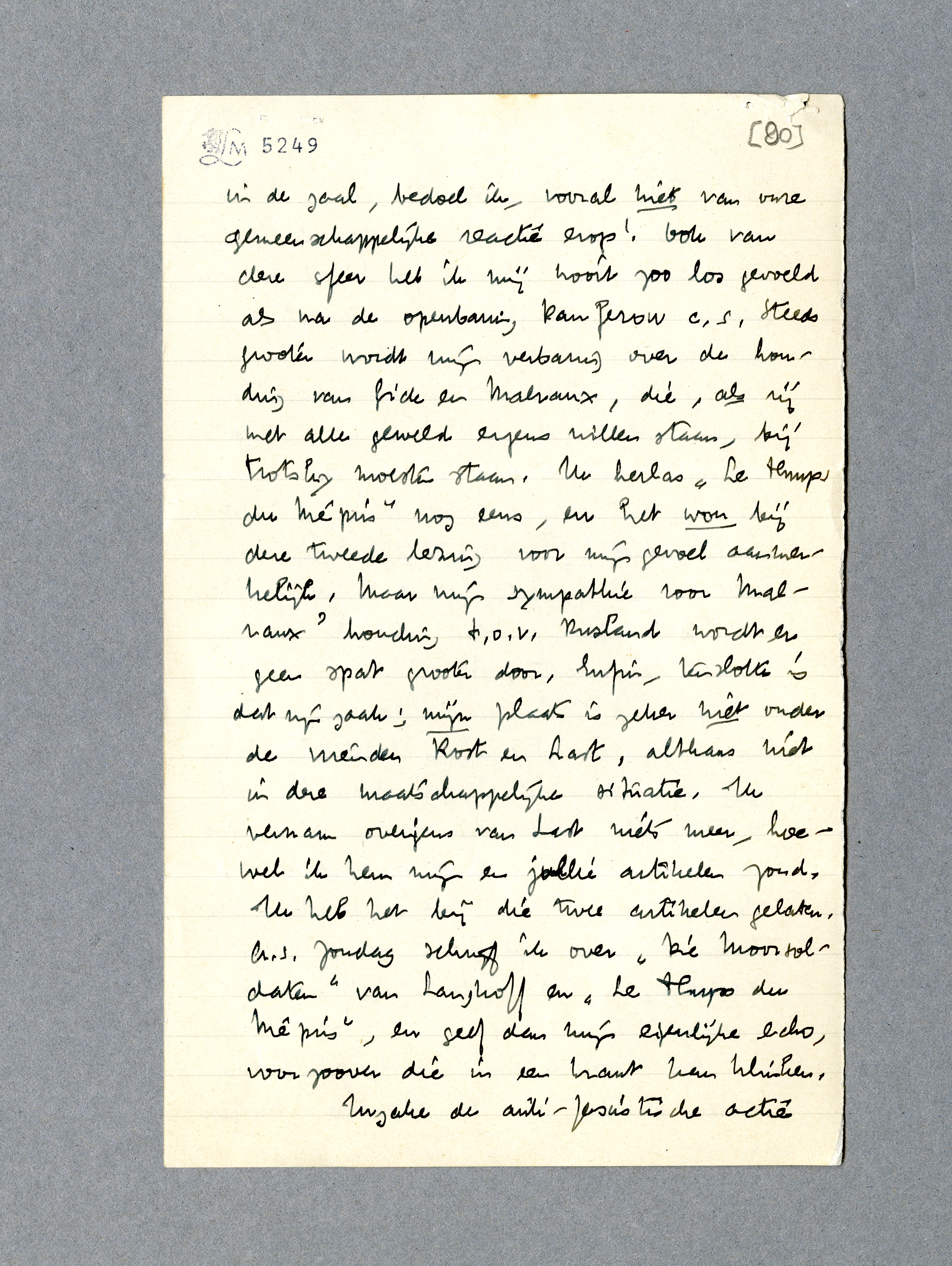 De nasmaak van het Congres is nog steeds slecht; van de algemeene atmosfeer in de zaal, bedoel ik, vooral niet van onze gemeenschappelijke reactie erop! Ook van deze sfeer heb ik mij nooit zoo los gevoeld als na de openbaring Panferof c.s. Steeds grooter wordt mijn verbazing over de houding van Gide en Malraux, die, als zij met alle geweld ergens willen staan, bij Trotsky moesten staan. Ik herlas Le Temps du Mépris nog eens, en het won bij deze tweede lezing voor mijn gevoel aanmerkelijk. Maar mijn sympathie voor Malraux' houding t.o.v. Rusland wordt er geen spat grooter door. Enfin, tenslotte is dat zijn zaak; mijn plaats is zeker niet onder de vrienden Rost en Last, althans niet in deze maatschappelijke situatie. Ik vernam overigens van Last niets meer, hoewel ik hem mijn en jullie artikelen zond. Ik heb het bij die twee artikelen gelaten. A.s. Zondag schrijf ik over Die Moorsoldaten van Langhoff en Le Temps du Mépris, en geef dan mijn eigenlijke echo, voor zoover die in een krant kan klinken.