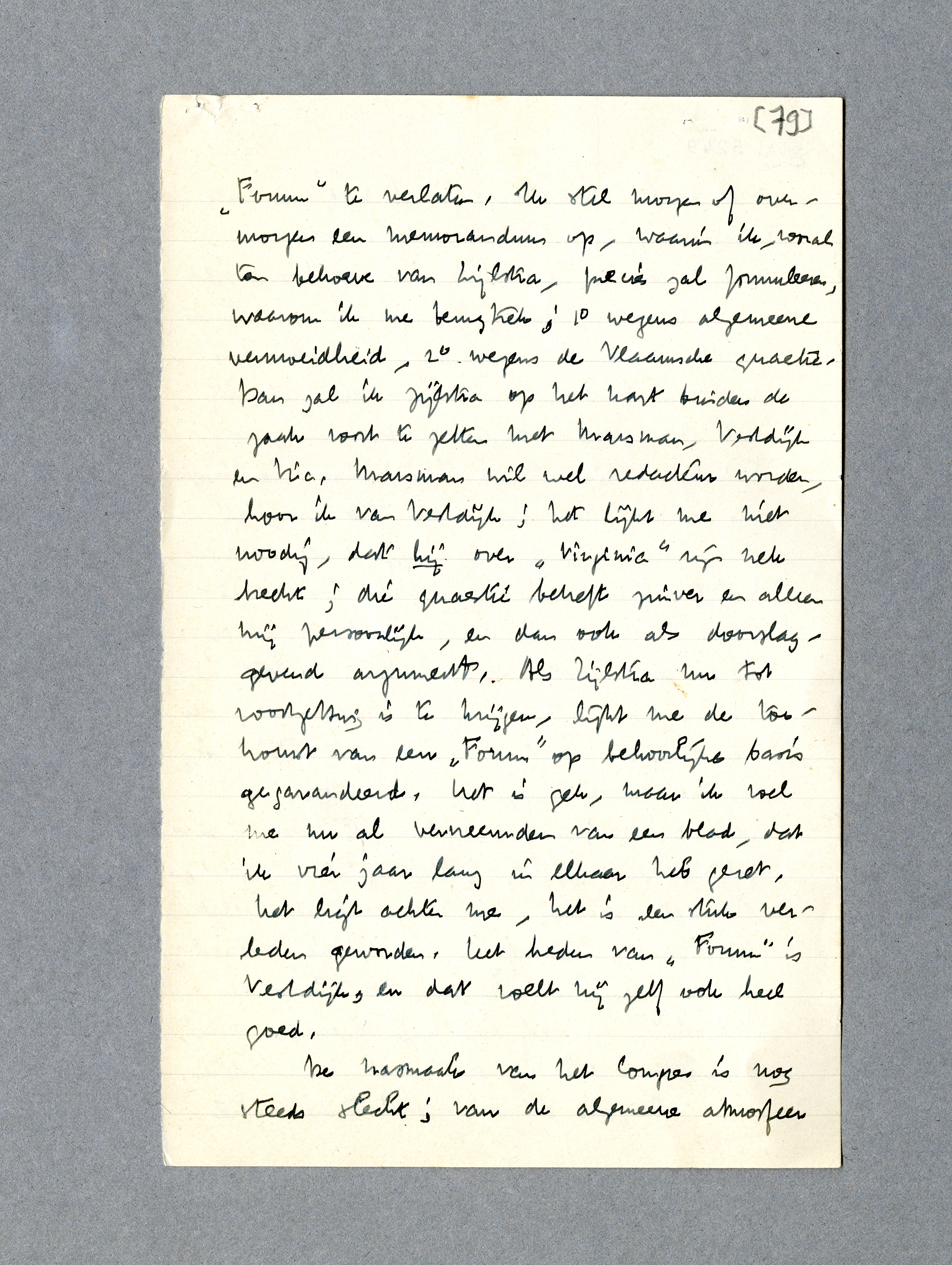 Vestdijk is weer terug komen fietsen. Zooals ik dacht, heeft hij niet voor de Maatschappij bedankt. Wel heeft hij de protestactie tegen de Maatschappij onderteekend; maar hij zei tegen mij, dat hij om economische redenen op het lidmaatschap was gesteld. Marsman schijnt dit niet erg of onvriendschappelijk te vinden. En ik... och, ik wist, dat hij niet zou bedanken, en ik sta al zoo vrij tegenover hem, dat ik deze gemankeerde geste als volkomen passend bij zijn figuur zie. En telkens als ik aan de basis denk, waarop hij moet bestaan, ontbreekt me ook de moed hem er hard over te vallen, al zou ik zelf liever kapper worden dan in zulke omstandigheden in zulk een gezelschap treden. Maar des te vaster wordt mijn besluit, Forum te verlaten. Ik stel morgen of overmorgen een memorandum op, waarin ik, vooral ten behoeve van Zijlstra, precies zal formuleeren, waarom ik me terugtrek; 1o wegens algemeene vermoeidheid, 2o wegens de Vlaamsche quaestie. Dan zal ik Zijlstra op het hart binden de zaak voort te zetten met Marsman, Vestdijk en Vic. Marsman wil wel redacteur worden, hoor ik van Vestdijk; het lijkt me niet noodig, dat hij over Virginia zijn nek breekt; die quaestie betreft zuiver en alleen mij persoonlijk, en dan ook als doorslaggevend argument. Als Zijlstra nu tot voortzetting is te krijgen, lijkt me de toekomst van een Forum op behoorlijke basis gegarandeerd. Het is gek, maar ik voel me nu al vervreemden van een blad, dat ik vier jaar lang in elkaar heb gezet, het ligt achter me, het is een stuk verleden geworden. Het heden van Forum is Vestdijk, en dat voelt hij zelf ook heel goed.