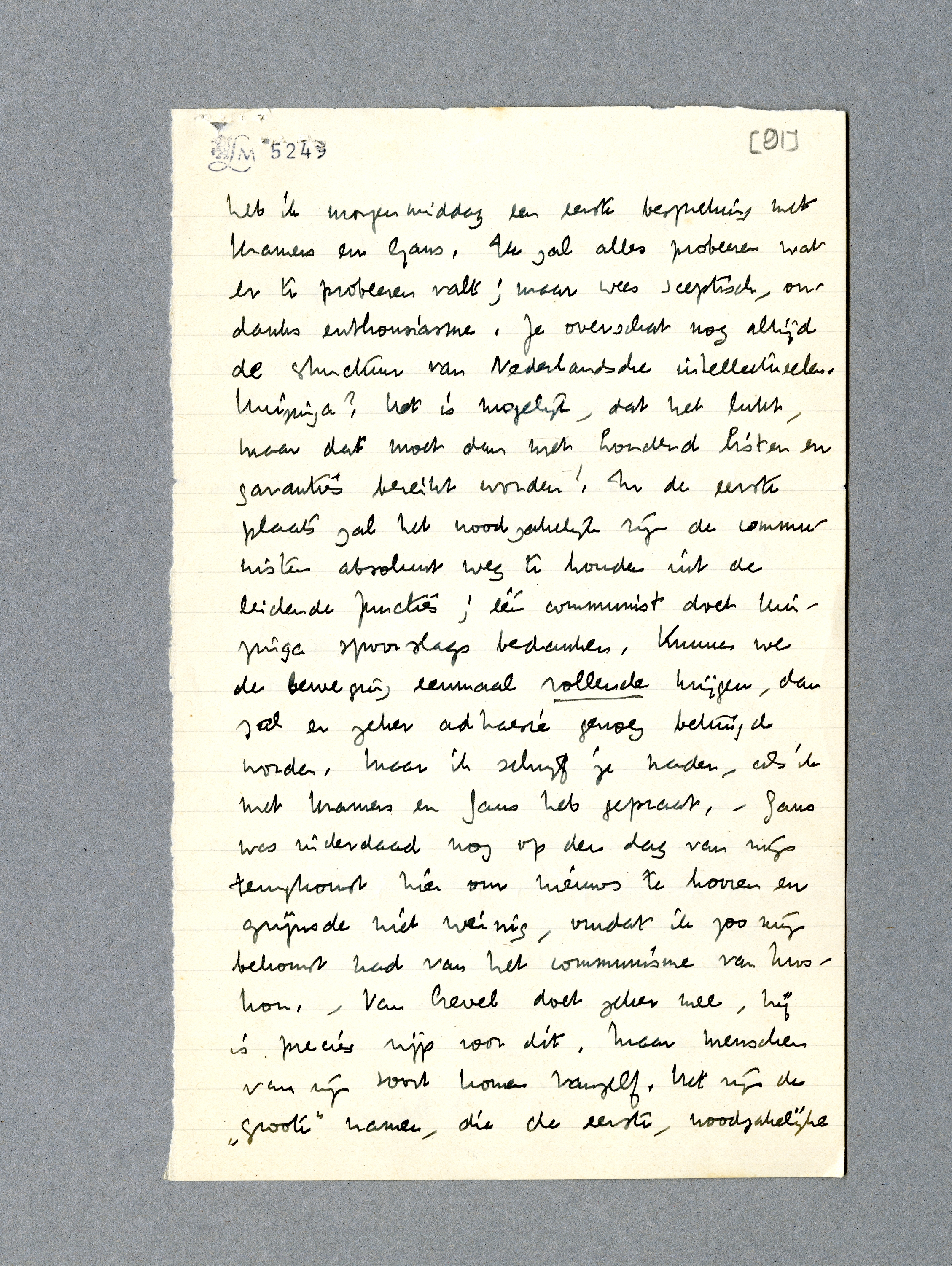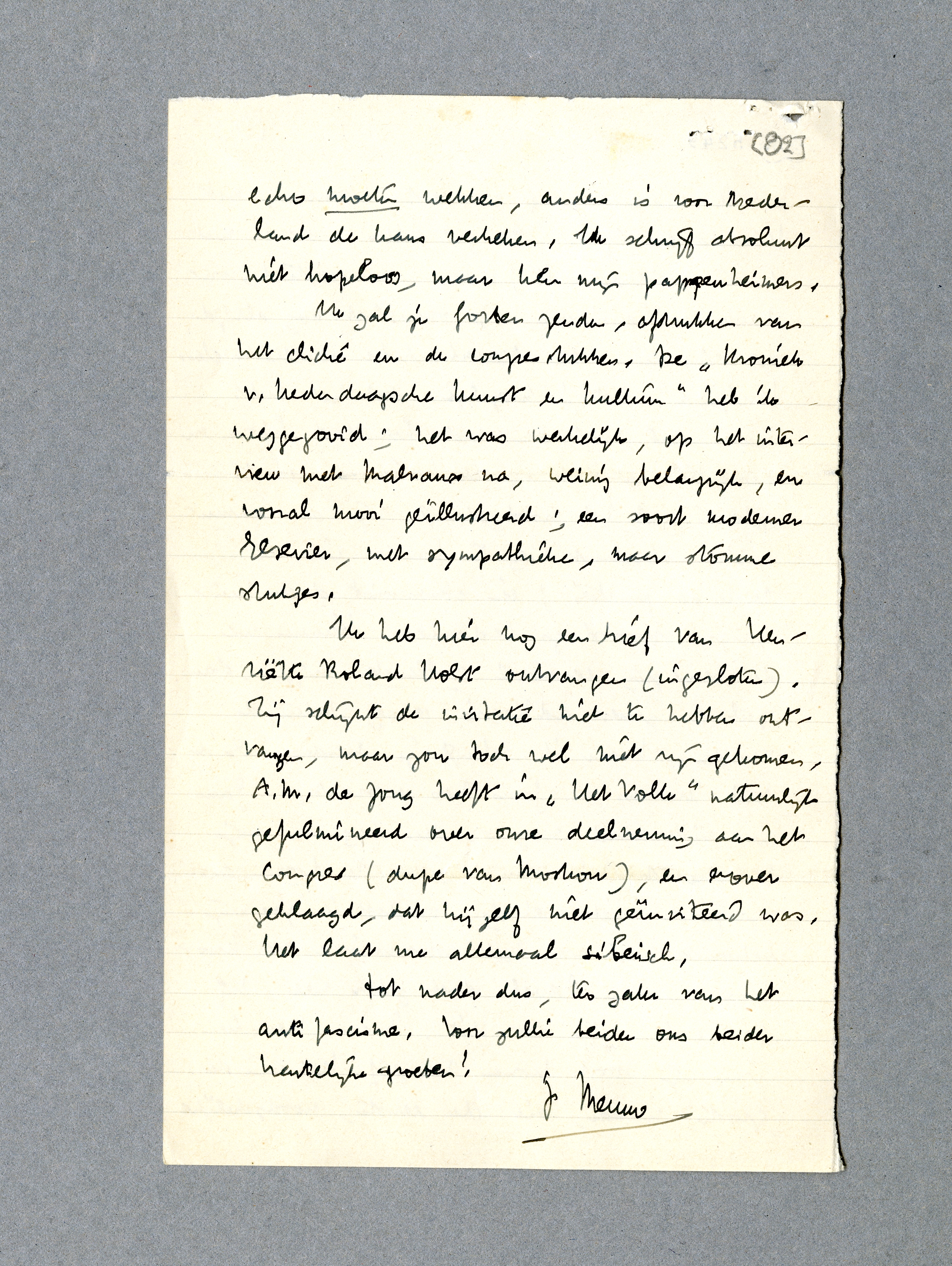 Inzake de anti-fascistische actie heb ik morgenmiddag een eerste bespreking met Kramers en Gans. Ik zal alles probeeren wat er te probeeren valt; maar wees sceptisch, ondanks enthousiasme. Je overschat nog altijd de structuur van Nederlandsche intellectueelen. Huizinga? Het is mogelijk, dat het lukt, maar dat moet dan met honderd listen en garanties bereikt worden! In de eerste plaats zal het noodzakelijk zijn de communisten absoluut weg te houden uit de leidende functies; één communist doet Huizinga spoorslags bedanken. Kunnen we de beweging eenmaal rollende krijgen, dan zal er zeker adhaesie genoeg betuigd worden. Maar ik schrijf je nader, als ik met Kramers en Gans heb gepraat. - Gans was inderdaad nog op den dag van mijn terugkomst hier om nieuws te hooren en grijnsde niet weinig, omdat ik zoo mijn bekomst had van het communisme van Moskou. - Van Crevel doet zeker mee, hij is precies rijp voor dit. Maar menschen van zijn soort komen vanzelf. Het zijn de ‘groote’ namen, die de eerste, noodzakelijke echo moeten wekken, anders is voor Nederland de kans verkeken. Ik schrijf absoluut niet hopeloos, maar ken mijn pappenheimers.