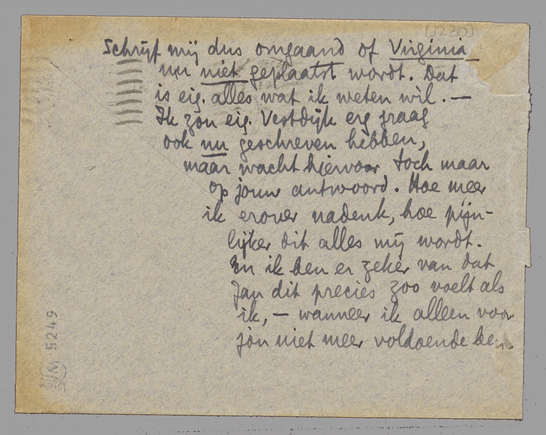 Schrijf mij dus omgaand of Virginia nu niet geplaatst wordt. Dat is eig. alles wat ik weten wil. - Ik zou eig. Vestdijk erg graag ook nu geschreven hebben, maar wacht hiervoor toch maar op jouw antwoord. Hoe meer ik erover nadenk, hoe pijnlijker dit alles mij wordt. En ik ben er zeker van dat Jan dit precies zoo voelt als ik, - wanneer ik alleen voor jou niet meer voldoende ben.