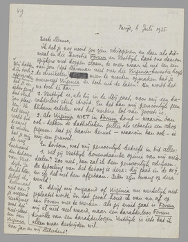 Ik heb je nog nooit zoo zien schipperen en doen als ditmaal in die kwestie Forum en Vestdijk. Laat ons daarom spijkers met koppen slaan, te meer waar ik uit een zin van jou (dat Marsman niet over die Virginia-kwestie hoeft te struikelen) meen te moeten opmaken dat je overweegt Virginia er toch uit te laten. [Wij hadden hier toch ± afgesproken dat je in ieder geval dat stuk zou plaatsen. Ik heb eenig recht het treurig te vinden dat je mij de rug toedraait ten behoeve van Vestdijk. Je denkt dààr geloof ik heelemaal niet aan? je negeert rustigweg wat het niet-plaatsen van Virginia voor Jan en mij beteekent.] Nu wordt het me toch tè bar.