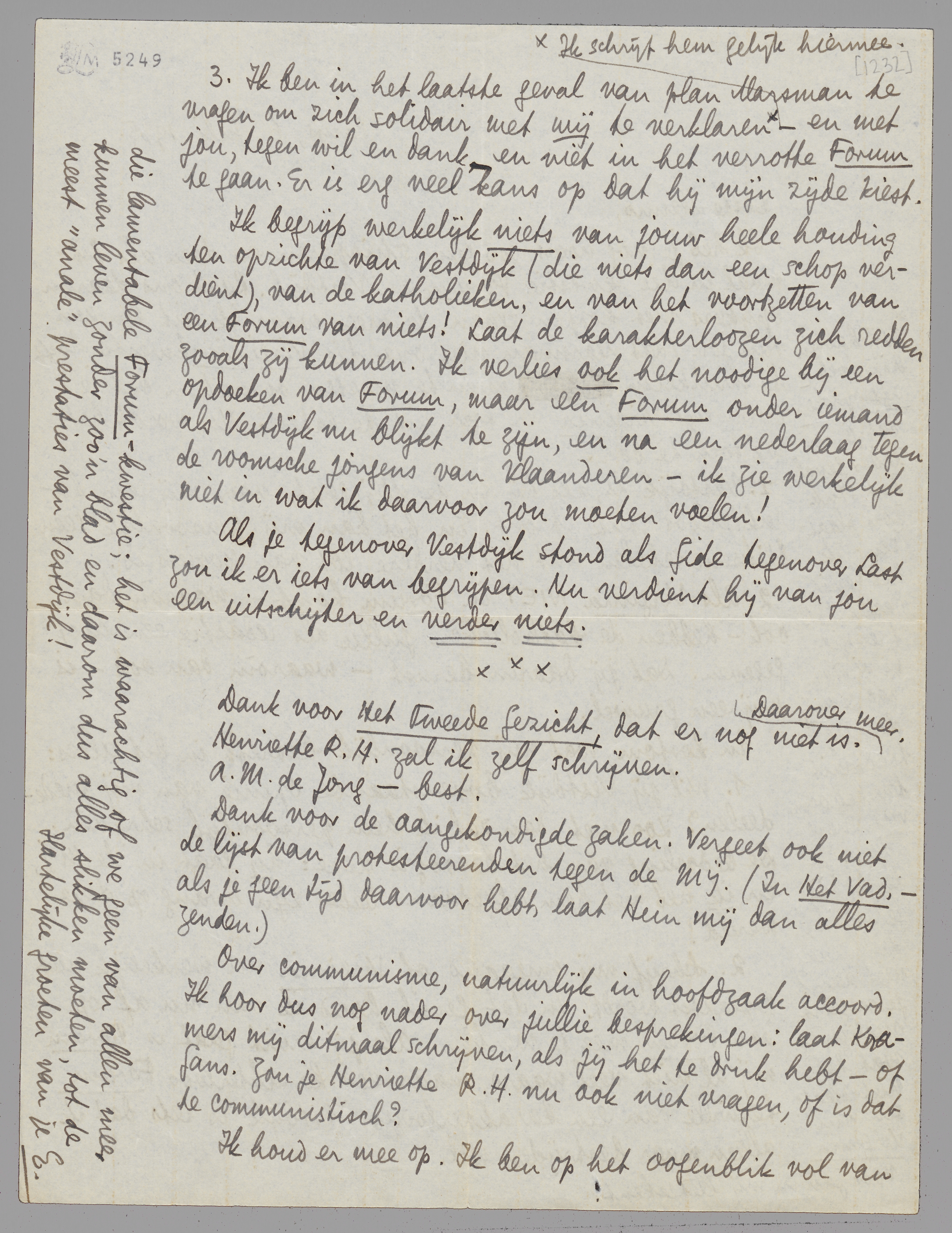 Ik begrijp werkelijk niets van jouw heele houding ten opzichte van Vestdijk (die niets dan een schop verdient), van de katholieken, en van het voortzetten van een Forum van niets! Laat de karakterloozen zich redden zooals zij kunnen. Ik verlies ook het noodige bij een opdoeken van Forum, maar een Forum onder iemand als Vestdijk nu blijkt te zijn, en na een nederlaag tegen de roomsche jongens van Vlaanderen - ik zie werkelijk niet in wat ik daarvoor zou moeten voelen!