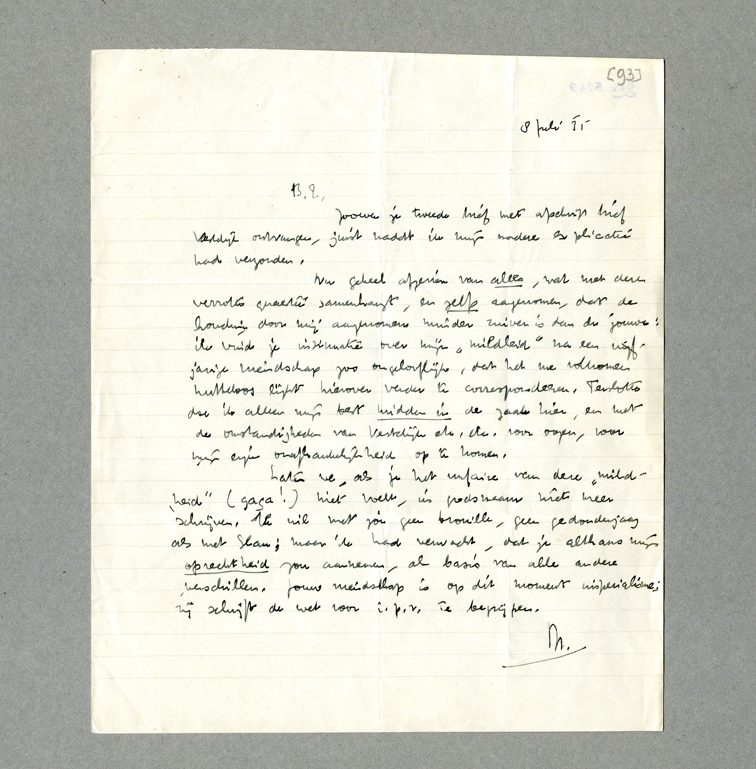 Nu geheel afgezien van alles, wat met deze verrotte quaestie samenhangt, en zelfs aangenomen, dat de houding door mij aangenomen minder zuiver is dan de jouwe: ik vind je insinuatie over mijn ‘mildheid’ na een vijfjarige vriendschap zoo ongelooflijk, dat het me volkomen nutteloos lijkt hierover verder te correspondeeren. Tenslotte doe ik alleen mijn best midden in de zaak hier, en met de omstandigheden van Vestdijk etc. etc. voor oogen, voor mijn eigen onafhankelijkheid op te komen.
