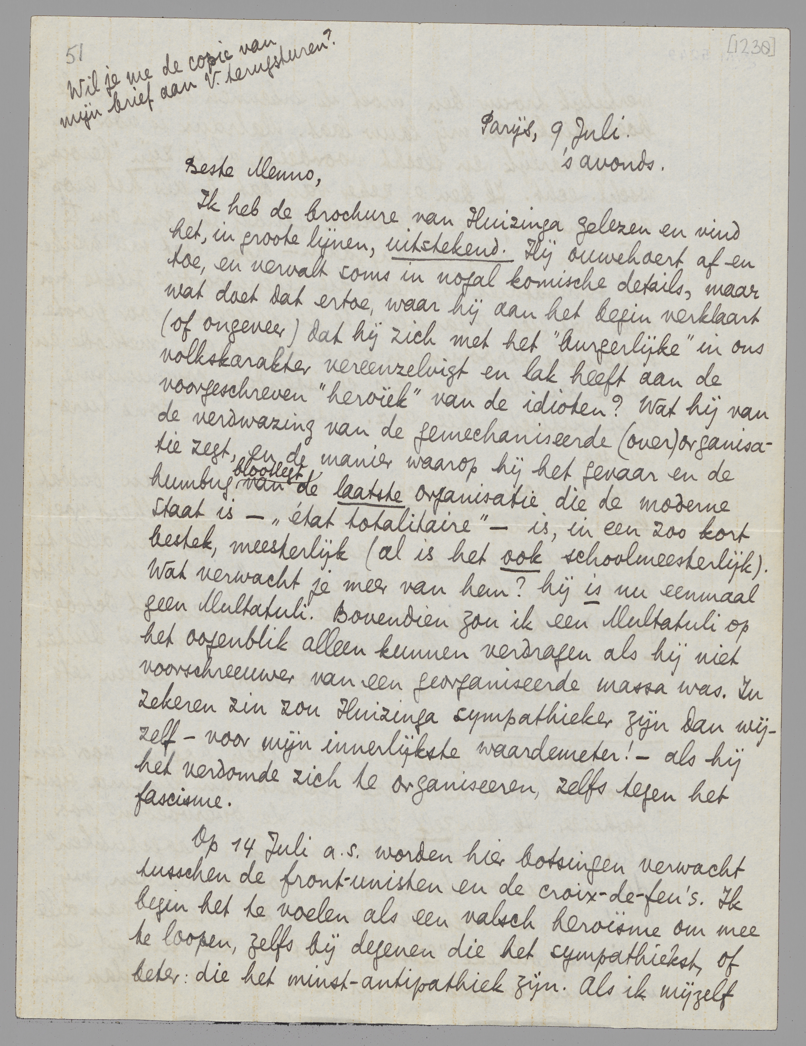 Op 14 Juli a.s. worden hier botsingen verwacht tusschen de front-unisten en de croix-de-feu's. Ik begin het te voelen als een valsch heroïsme om mee te loopen, zelfs bij degenen die het sympathiekst, of beter: die het minst-antipathiek zijn. Als ik mijzelf werkelijk trouw ben, moet ik erkennen dat de heele boel stinkt, en mij lauw laat. Malraux is voor mij een gevaarlijk en slecht voorbeeld, al is zijn ‘heroisme’ wschl. echt. Ik ben er zeker van dat ik, als het erop aankomt, nog wel ‘heroïsch’ genoeg zal zijn om te crêpeeren - vlug of langzaam - voor wat mij werkelijk sympathiek is, maar die tegenwoordige ziekte om alles wat zich organiseert te justifieeren door groote historische stroomingen en beschavingen (methode en manie van Malraux) als christendom, communisme, bolsjewistische idee, enz., maken mij au fond tureluursch.
