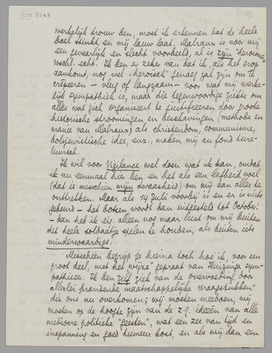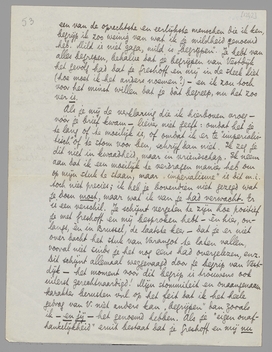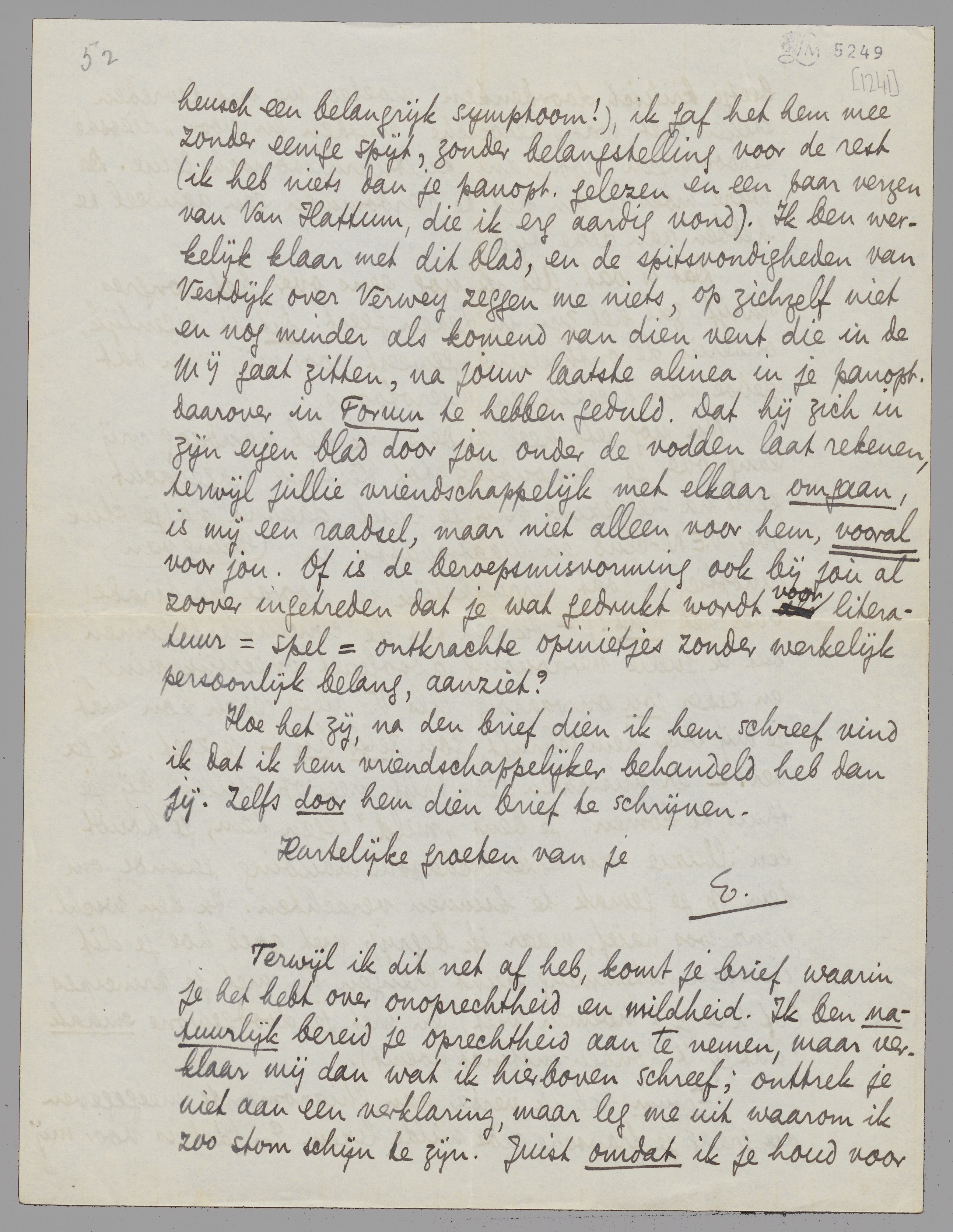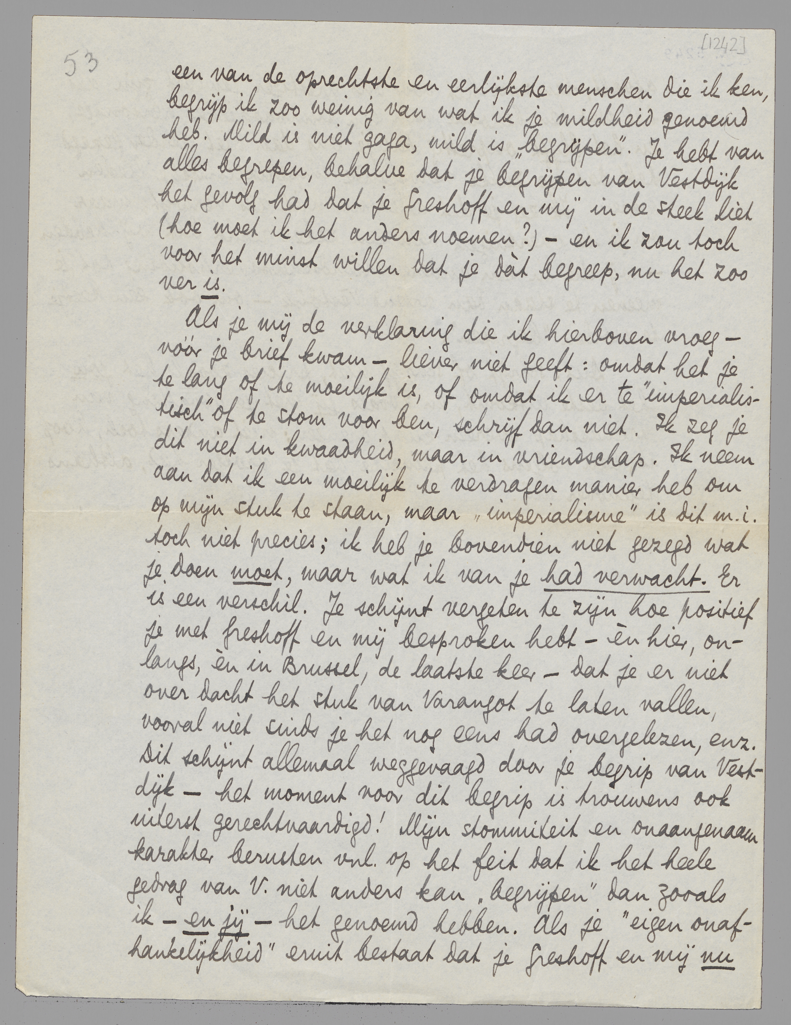 Terwijl ik dit net af heb, komt je brief waarin je het hebt over onoprechtheid en mildheid. Ik ben natuurlijk bereid je oprechtheid aan te nemen, maar verklaar mij dan wat ik hierboven schreef; onttrek je niet aan een verklaring, maar leg me uit waarom ik zoo stom schijn te zijn. Juist omdat ik je houd voor een van de oprechtste en eerlijkste menschen die ik ken, begrijp ik zoo weinig van wat ik je mildheid genoemd heb. Mild is niet gaga, mild is ‘begrijpen’. Je hebt van alles begrepen, behalve dat je begrijpen van Vestdijk het gevolg had dat je Greshoff en mij in de steek liet (hoe moet ik het anders noemen?) - en ik zou toch voor het minst willen dat je dàt begreep, nu het zoover is.