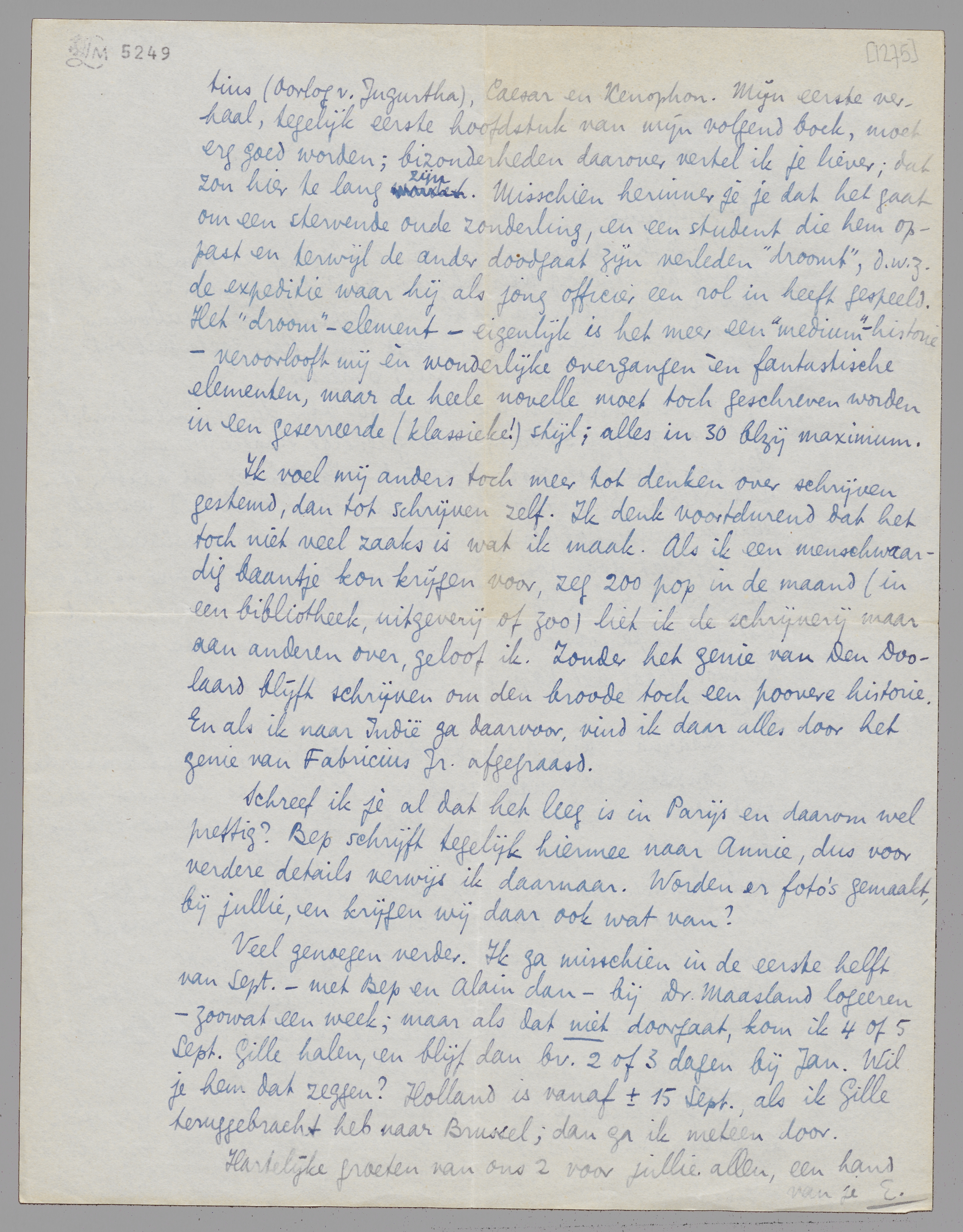 Veel genoegen verder. Ik ga misschien in de eerste helft van Sept. - met Bep en Alain dan - bij Dr. Maasland logeeren - zoowat een week; maar als dat niet doorgaat, kom ik 4 of 5 Sept. Gille halen, en blijf dan bv. 2 of 3 dagen bij Jan. Wil je hem dat zeggen? Holland is vanaf ± 15 Sept., als ik Gille teruggebracht heb naar Brussel; dan ga ik meteen door.