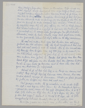 Ik verdiende aan Querido fl. 50. - voor de verhalenbundel; daarvan ging fl. 36.50 af voor geleverde Smalle Mensen en Landen van Herkomst, rest: fl. 13.50! - Ik schreef nu haastig een paar blzn. Blocnotes voor Kristal (na herhaald verzoek van mevrouw van Lokhorst) en door de stroom meegesleurd ga ik nu nog wat door voor Forum. Voor Sept. zal het wel te laat zijn; maar reken op eenige blzn. Blocnote voor October + wschl. een panopticum (over Rimbaud en Decorte - ik zou daarvoor graag het papier hebben dat ik voor jou in elkaar zette.)