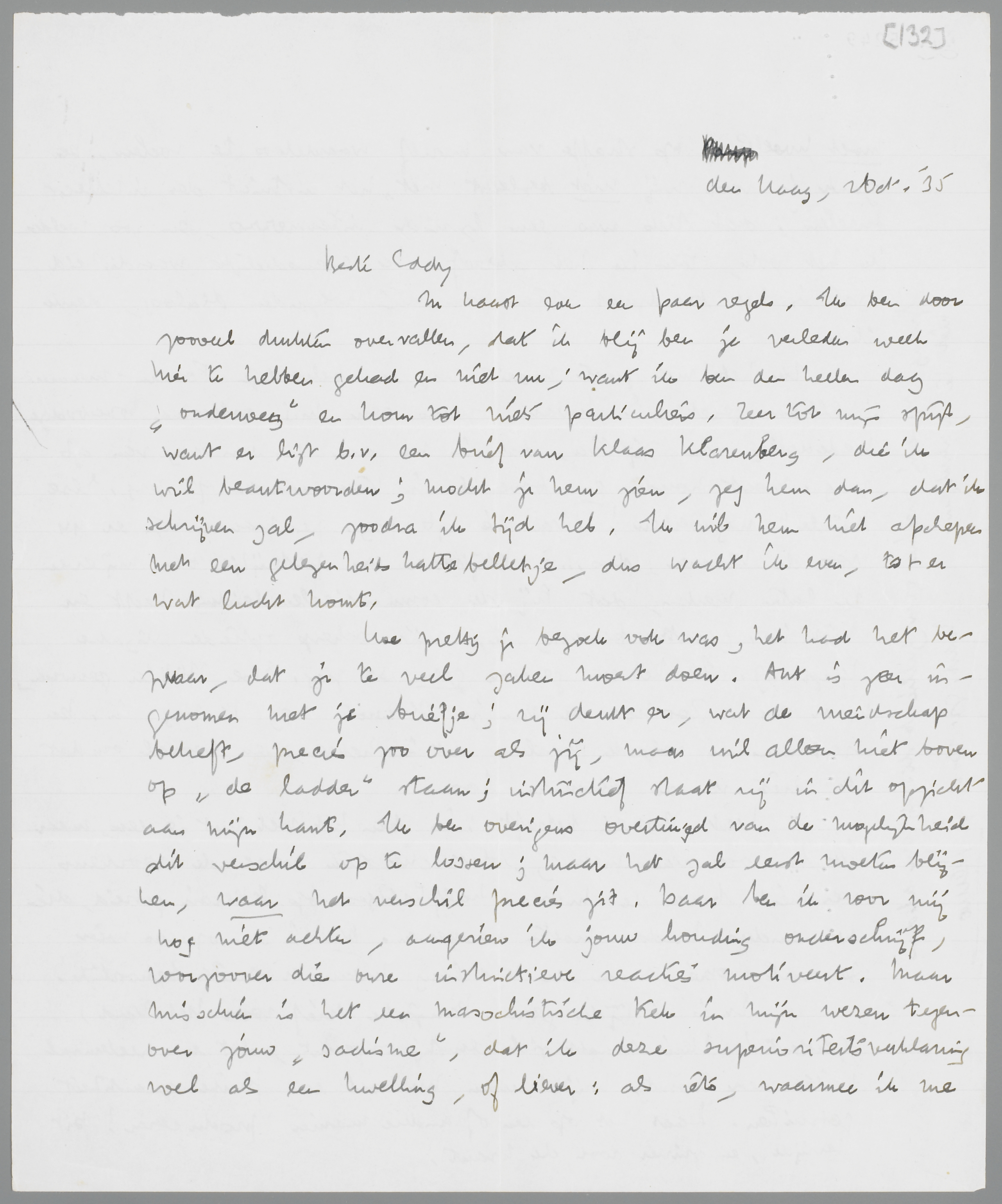 Hoe prettig je bezoek ook was, het had het bezwaar, dat je te veel zaken moest doen. Ant is zeer ingenomen met je briefje; zij denkt er, wat de vriendschap betreft, precies zoo over als jij, maar wil alleen niet boven op ‘de ladder’ staan; instinctief staat zij in dit opzicht aan mijn kant. Ik ben overigens overtuigd van de mogelijkheid dit verschil op te lossen; maar het zal eerst moeten blijken, waar het verschil precies zit. Daar ben ik voor mij nog niet achter, aangezien ik jouw houding onderschrijf, voorzoover die onze instinctieve reacties motiveert. Maar misschien is het een masochistische trek in mijn wezen tegenover jouw ‘sadisme’, dat ik deze superioriteitsverklaring voel als een kwelling, of liever: als iets, waarmee ik me moet kwellen, op straffe van mezelf waardeloos te voelen. De zaak is voor mij niet beslecht met ‘het instinct der intellectueelen’; dat stuk was een lyrisch intermezzo, en zoo voelde ik het ook, toen ik het schreef. De menschelijke waardigheid zal in het brandpunt staan van mijn volgenden dialoog, denk ik.