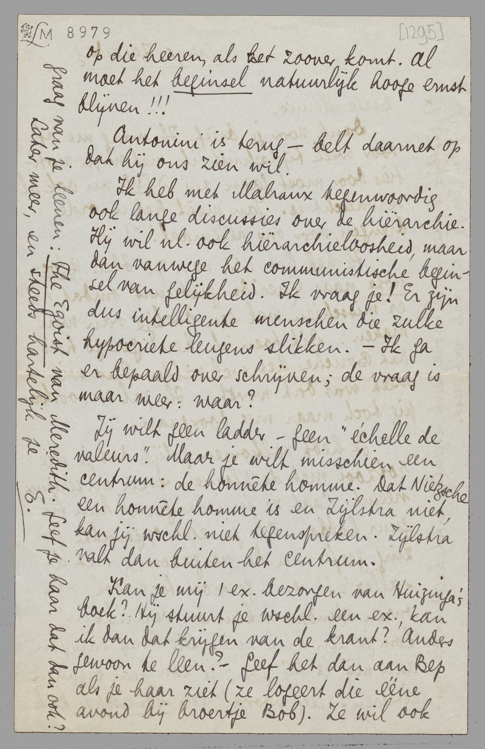 Ik heb met Malraux tegenwoordig ook lange discussies over de hiërarchie. Hij wil nl. ook hiërarchieloosheid, maar dan vanwege het communistische beginsel van gelijkheid. Ik vraag je! Er zijn dus intelligente menschen die zulke hypocriete leugens slikken. - Ik ga er bepaald over schrijven; de vraag is maar weer: waar?
