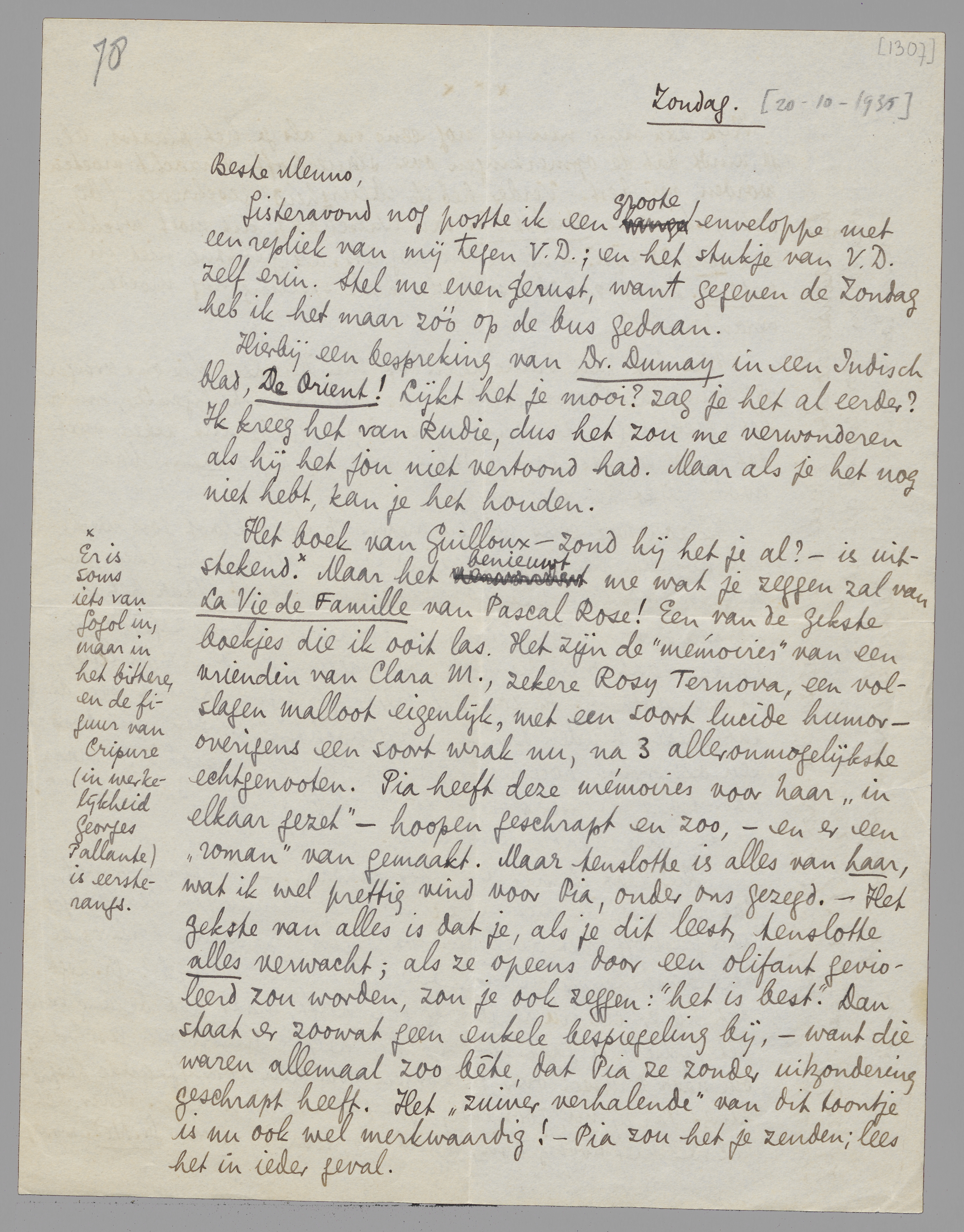 Het boek van Guilloux - zond hij het je al? - is uitstekend. [Er is soms iets van Gogol in, maar het bittere, en de figuur van Cripure (in werkelijkheid Georges Pallante) is eersterangs.] Maar het benieuwt me wat je zeggen zal van La Vie de Familie van Pascal Rose! Een van de gekste boekjes die ik ooit las. Het zijn de ‘mémoires’ van een vriendin van Clara M., zekere Rosy Ternova, een volslagen malloot eigenlijk, met een soort lucide humor - overigens een soort wrak nu, na 3 alleronmogelijkste echtgenooten. Pia heeft deze mémoires voor haar ‘in elkaar gezet’ - hoopen geschrapt en zoo, - en er een ‘roman’ van gemaakt. Maar tenslotte is alles van haar, wat ik wel prettig vind voor Pia, onder ons gezegd. - Het gekste van alles is dat je, als je dit leest, tenslotte alles verwacht; als ze opeens door een olifant gevioleerd zou worden, zou je ook zeggen: ‘het is best’. Dan staat er zoowat geen enkele bespiegeling bij, - want die waren allemaal zoo bête, dat Pia ze zonder uitzondering geschrapt heeft. Het ‘zuiver verhalende’ van dit toontje is nu ook wel merkwaardig! - Pia zou het je zenden; lees het in ieder geval.