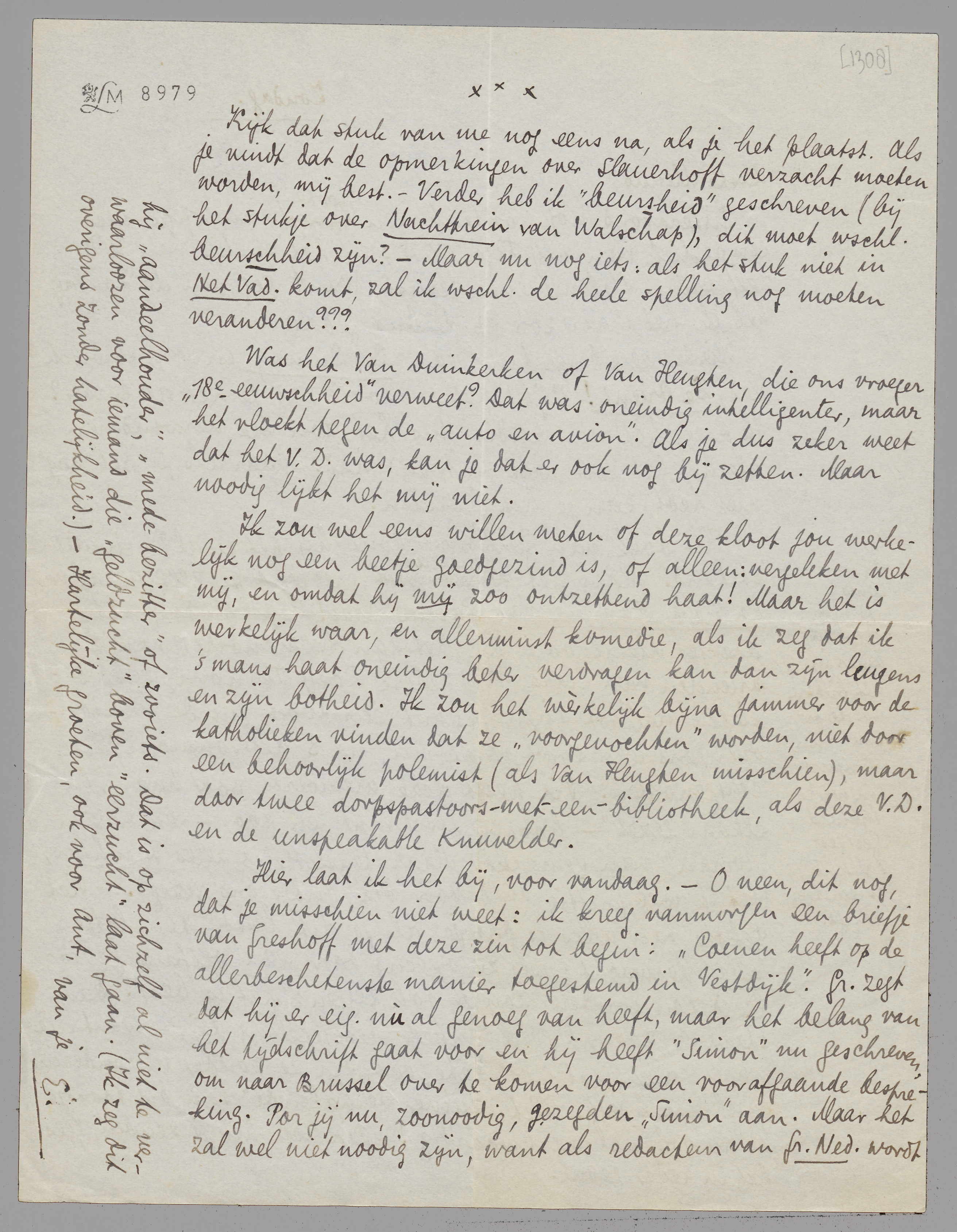 Kijk dat stuk van me nog eens na, als je het plaatst. Als je vindt dat de opmerkingen over Slauerhoff verzacht moeten worden, mij best. - Verder heb ik ‘beursheid’ geschreven (bij het stukje over Nachttrein van Walschap) dit moet wschl. beurschheid zijn? - Maar nu nog iets: als het stuk niet in Het Vad. komt, zal ik wschl. de heele spelling nog moeten veranderen???