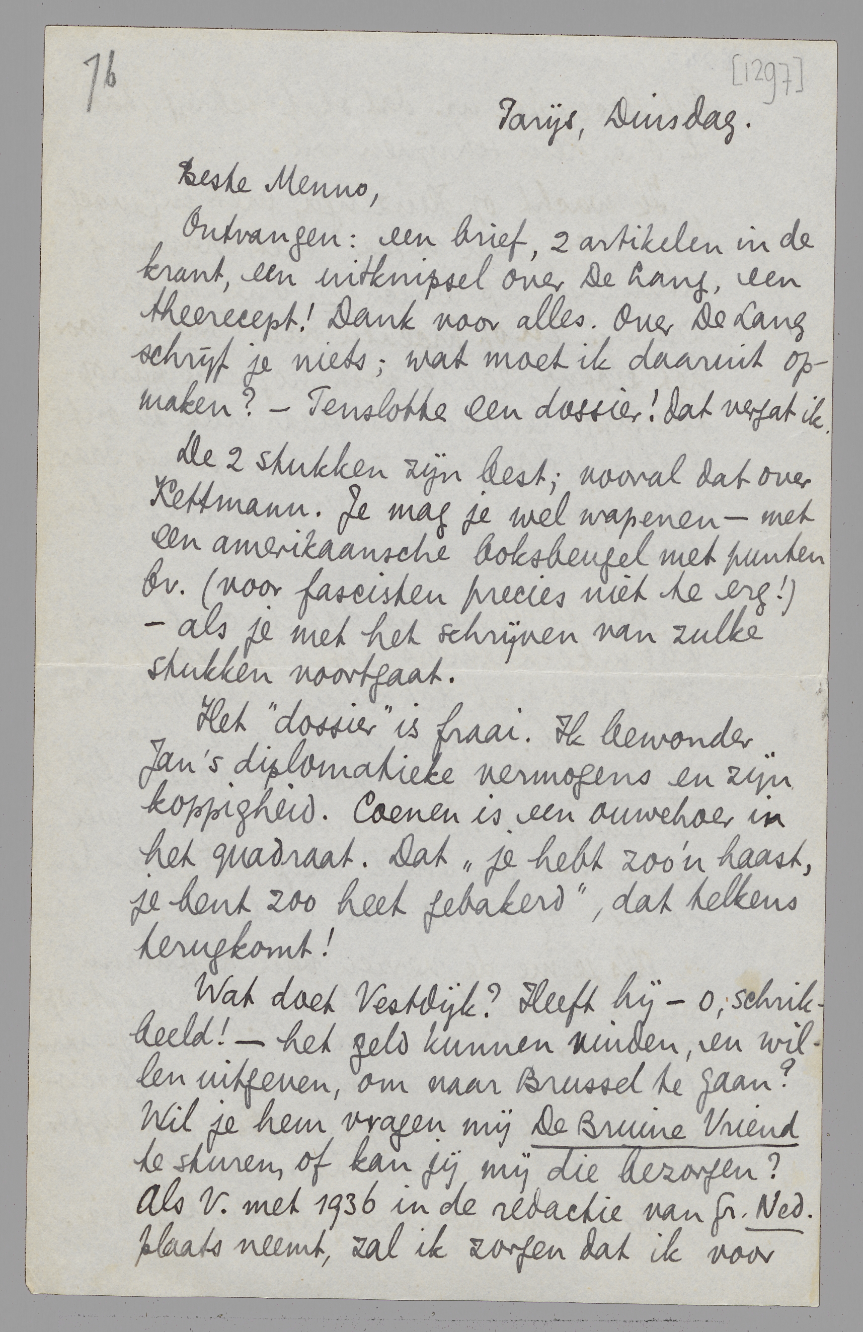 Wat doet Vestdijk? Heeft hij - o, schrikbeeld! - het geld kunnen vinden, en willen uitgeven, om naar Brussel te gaan? Wil je hem vragen mij De Bruine Vriend te sturen, of kan jij mij die bezorgen? Als V. met 1936 in de redactie van Gr. Ned. plaats neemt, zal ik zorgen dat ik voor het December - nr. dat stuk schrijf, dat ik over hem schrijven wil.