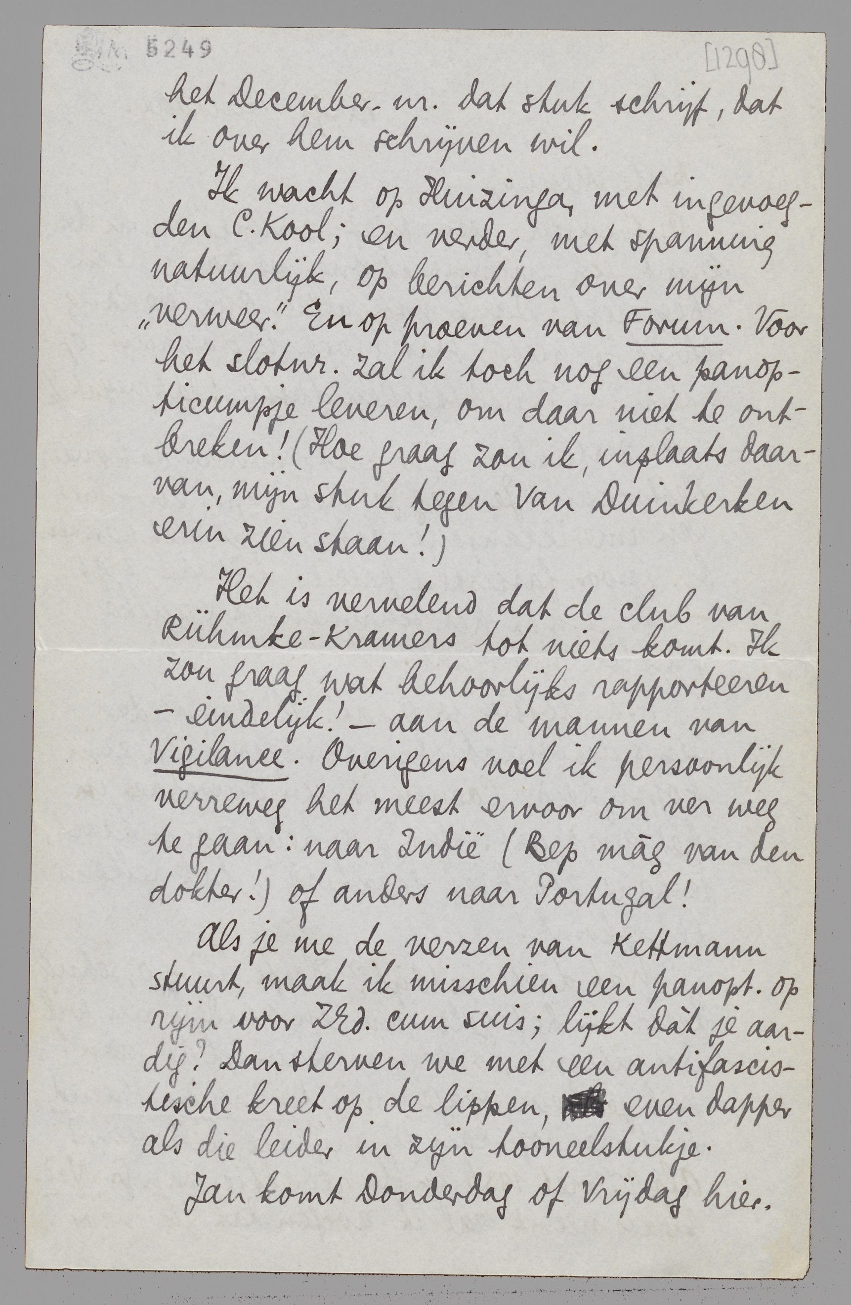 Ik wacht op Huizinga, met ingevoegden C. Kool; en verder, met spanning natuurlijk, op de berichten over mijn ‘verweer’. En op proeven van Forum. Voor het slotnr. zal ik toch nog een panopticumpje leveren, om daar niet te ontbreken! (Hoe graag zou ik, inplaats daarvan, mijn stuk tegen Van Duinkerken erin zien staan!)
