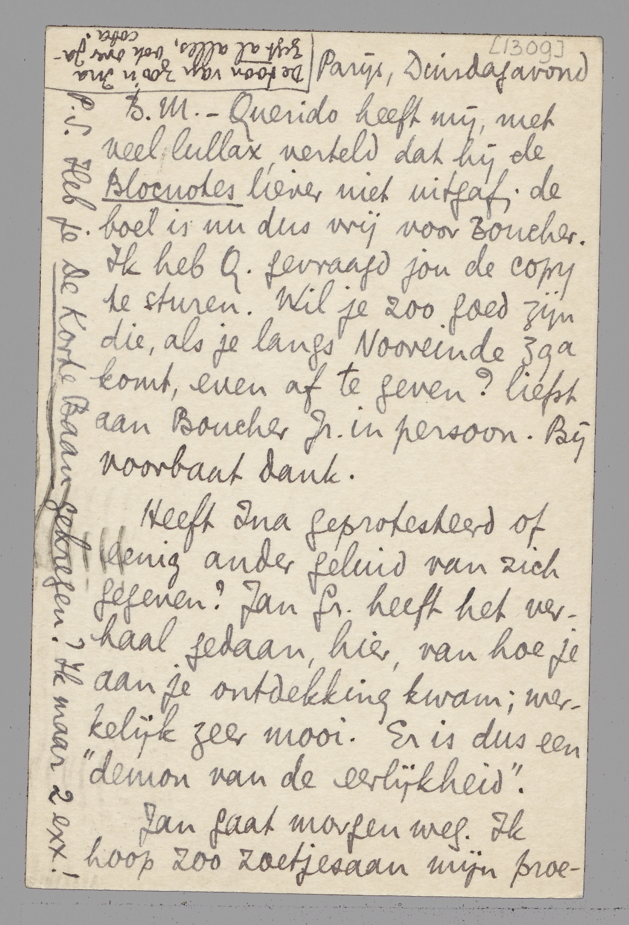 -Querido heeft mij, met veel lullax, verteld dat hij de Blocnotes liever niet uitgaf; de boel is nu dus vrij voor Boucher. Ik heb Q. gevraagd jou de copy te sturen. Wil je zoo goed zijn die, als je langs Noordeinde 39a komt, even af te geven? liefst aan Boucher Jr. in persoon. Bij voorbaat dank.