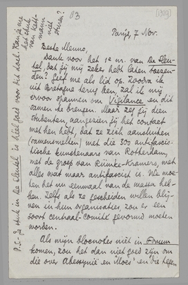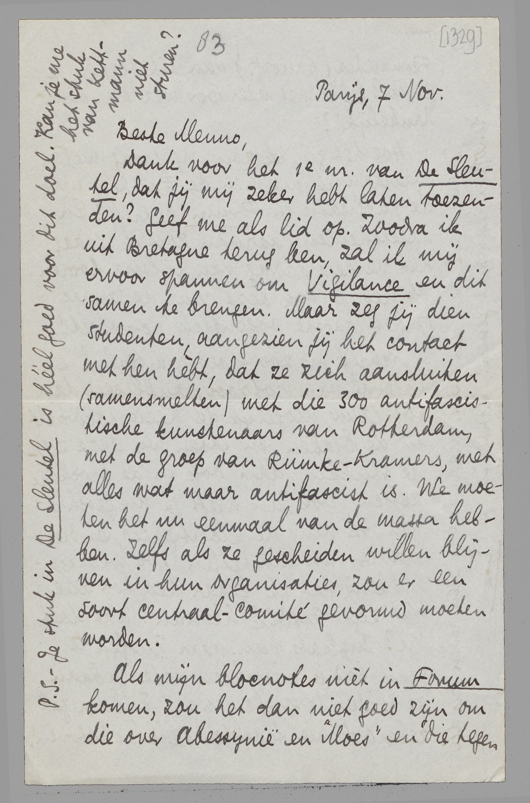 Dank voor het 1e nr. van De Sleutel, dat jij mij zeker hebt laten toezenden? Geef me als lid op. Zoodra ik uit Bretagne terug ben, zal ik mij ervoor spannen om Vigilance en dit samen te brengen. Maar zeg jij dien studenten, aangezien jij het contact met hen hèbt, dat ze zich aansluiten (samensmelten) met die 300 antifascistische kunstenaars van Rotterdam, met de groep van Rümke-Kramers, met alles wat maar antifascist is. We moeten het nu eenmaal van de massa hebben. Zelfs als ze gescheiden willen blijven in hun organisaties, zou er een soort centraal-comité gevormd moeten worden.