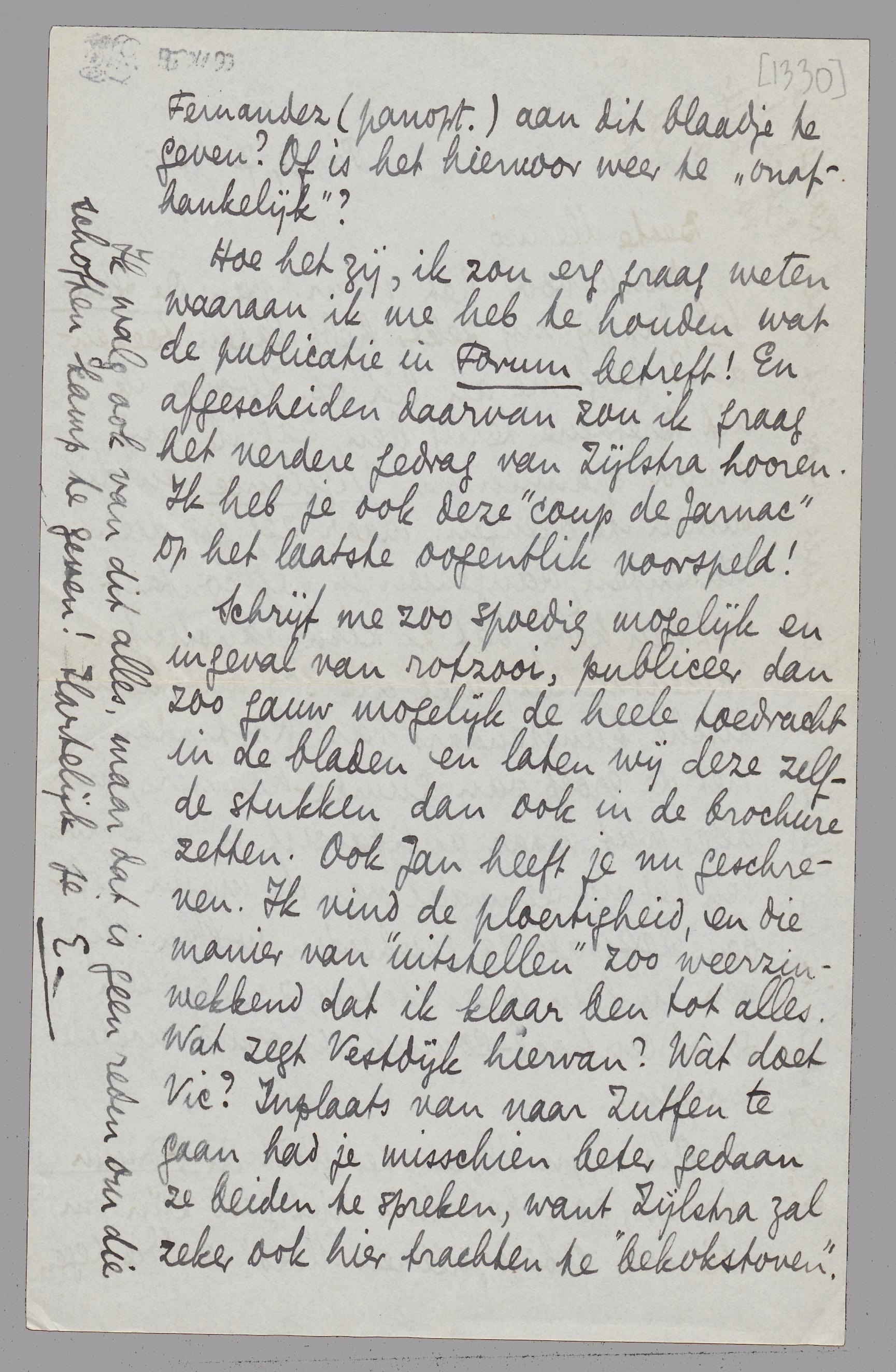 Hoe het zij, ik zou erg graag weten waaraan ik me heb te houden wat de publicatie in Forum betreft! En afgescheiden daarvan zou ik graag het verdere gedrag van Zijlstra hooren. Ik heb je ook deze ‘coup de Jarnac’ op het laatste oogenblik voorspeld!