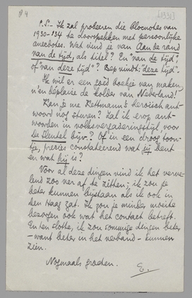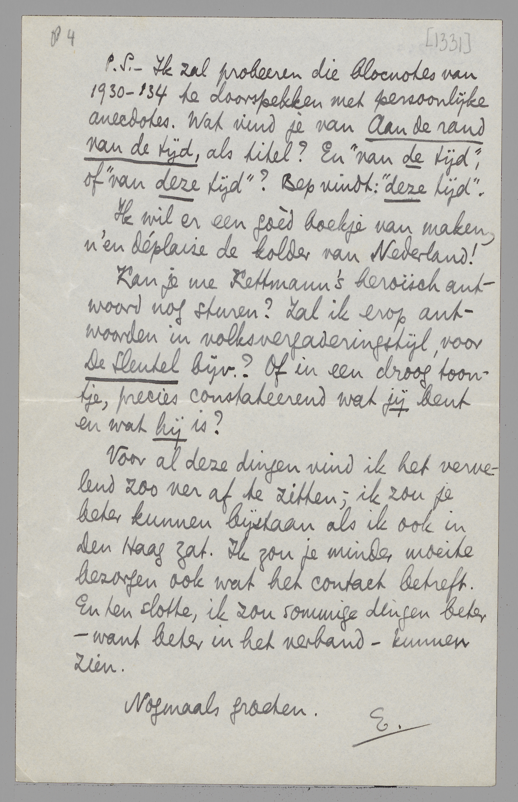 P.S. - Ik zal probeeren die blocnotes van 1930-'34 te doorspekken met persoonlijke anecdotes. Wat vind je van Aan de rand van de tijd, als titel? En ‘van de tijd’, of ‘van deze tijd’? Bep vindt: ‘deze tijd’.