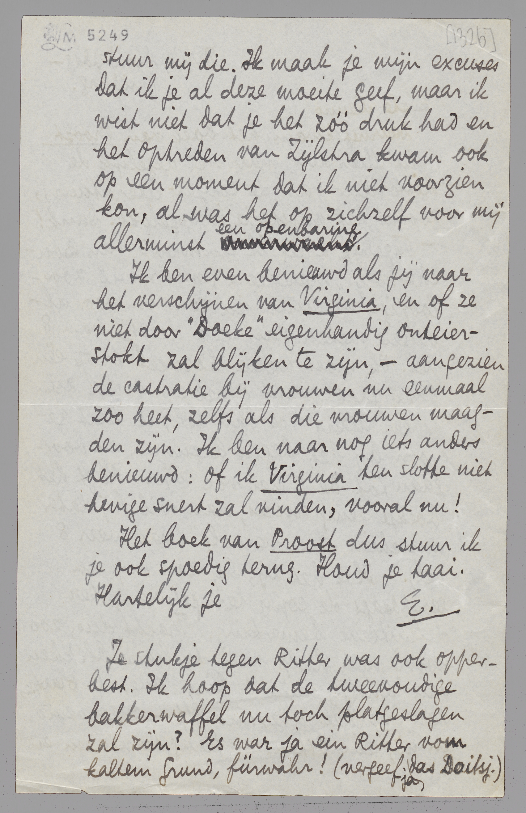 Ik ben even benieuwd als jij naar het verschijnen van Virginia, en of ze niet door ‘Doeke’ eigenhandig onteierstokt zal blijken te zijn, - aangezien de castratie bij vrouwen nu eenmaal zoo heet, zelfs als die vrouwen maagden zijn.