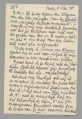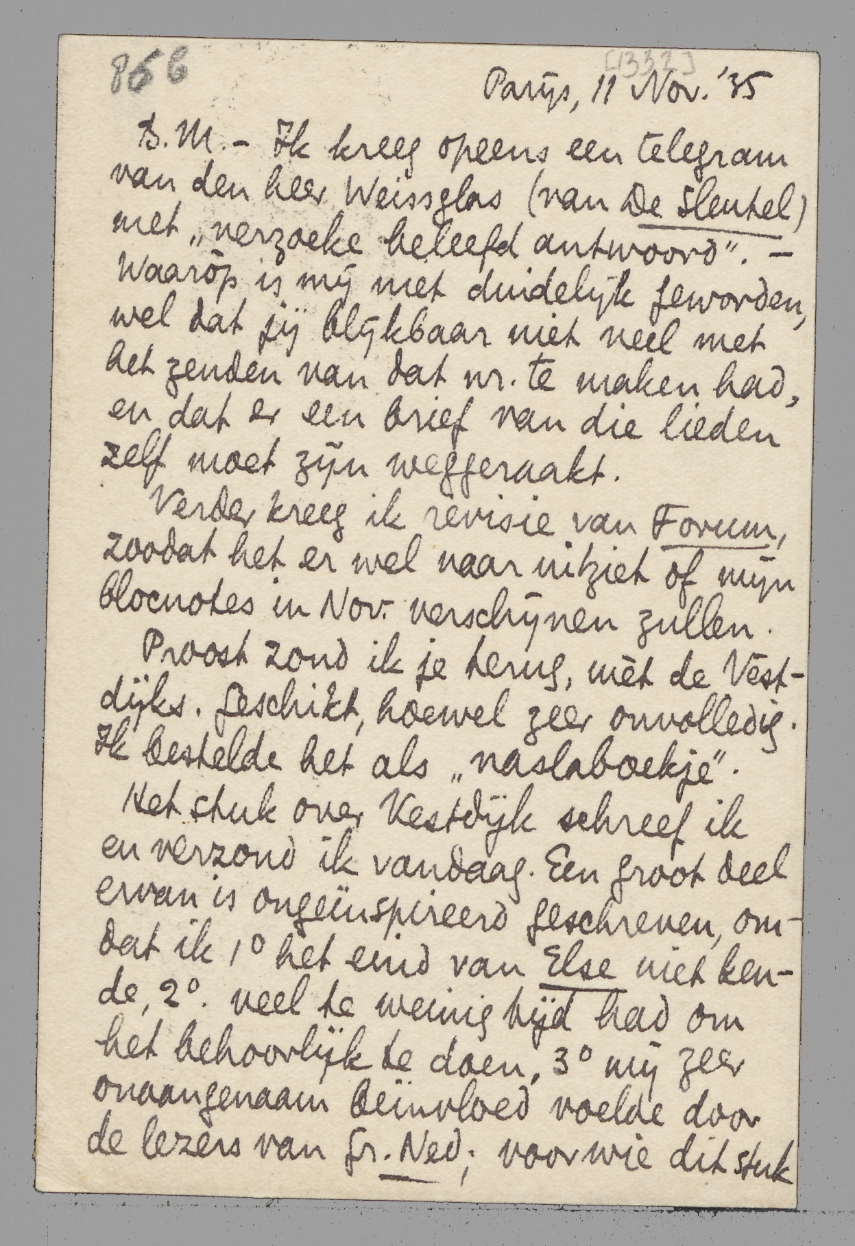 -Ik kreeg opeens een telegram van den heer Weissglas (van De Sleutel) met ‘verzoeke beleefd antwoord’. - Waarop is mij niet duidelijk geworden, wel dat jij blijkbaar niet veel met het zenden van dat nr. te maken had, en dat er een brief van die lieden zelf moet zijn weggeraakt.