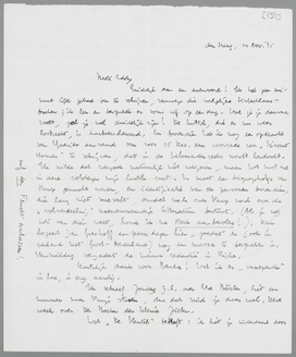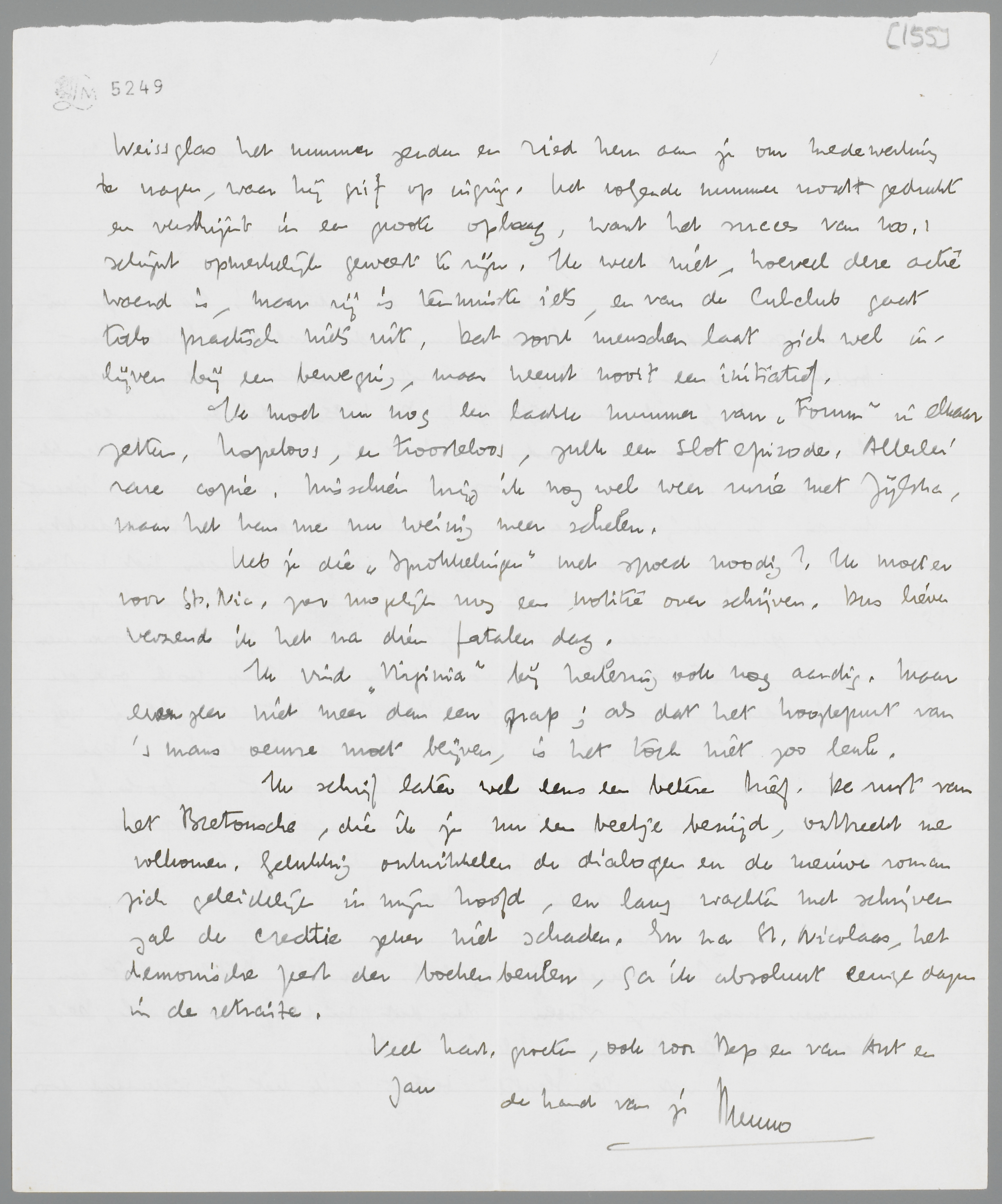 Wat De Sleutel betreft: ik liet je inderdaad door Weissglas het nummer zenden en ried hem aan je om medewerking te vragen, waar hij grif op inging. Het volgende nummer wordt gedrukt en verschijnt in een groote oplaag, want het succes van no. 1 schijnt opmerkelijk geweest te zijn. Ik weet niet, hoeveel deze actie waard is, maar zij is tenminste iets, en van de Culclub gaat toch practisch niets uit. Dat soort menschen laat zich wel inlijven bij een beweging, maar neemt nooit een initiatief.