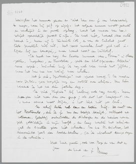 Ik schrijf later wel eens een betere brief. De rust van het Bretonsche, die ik je nu een beetje benijd, ontbreekt me volkomen. Gelukkig ontwikkelen de dialogen en de nieuwe roman zich geleidelijk in mijn hoofd, en lang wachten met schrijven zal de creatie zeker niet schaden. En na St. Nicolaas, het demonische feest der boekenbeulen, ga ik absoluut eenige dagen in de retraite.