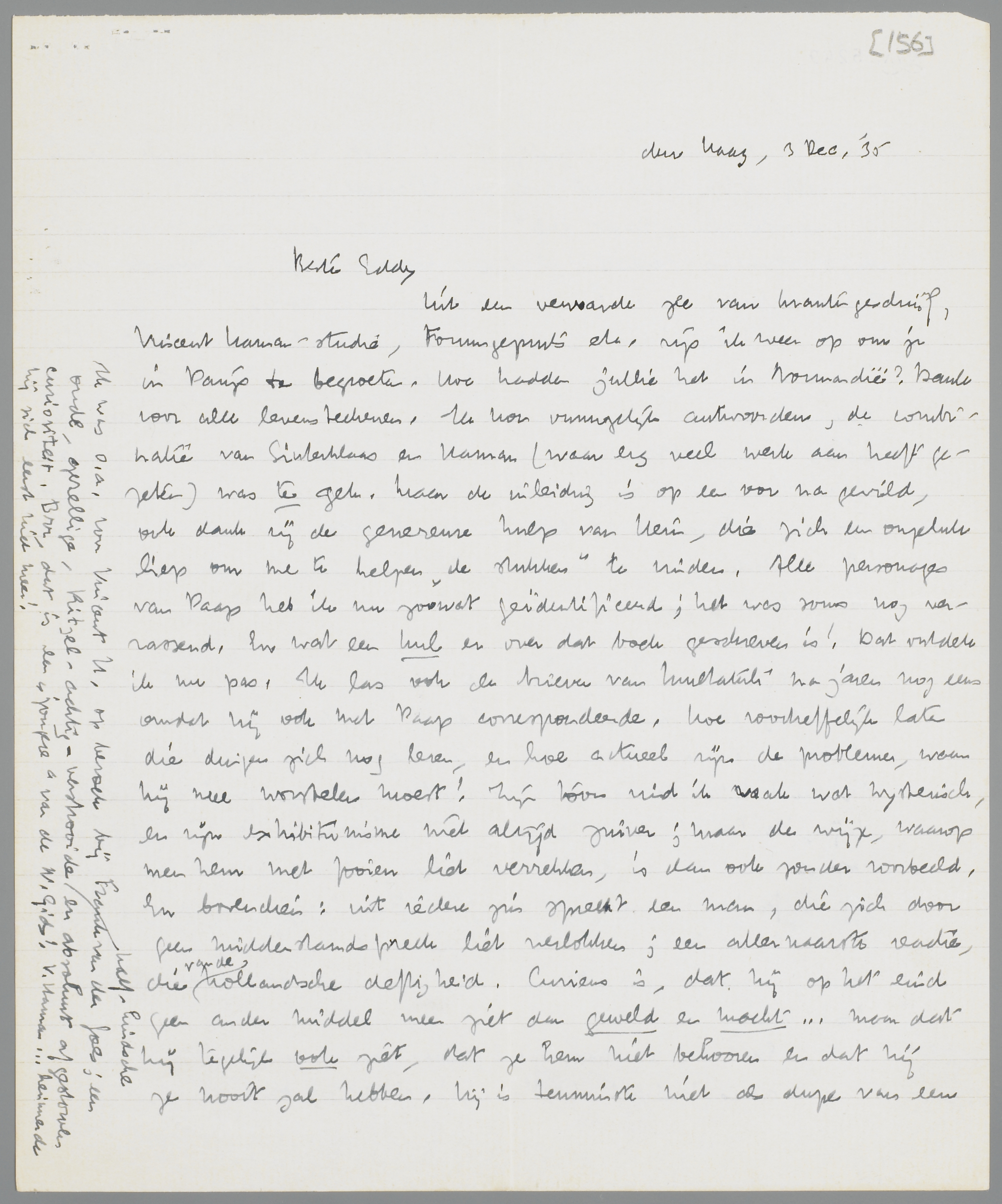 Uit een verwarde zee van krantengeschrijf, Vincent Hamanstudie, Forumgepruts etc. rijs ik weder op om je in Parijs te begroeten. Hoe hadden jullie het in Normandië? Dank voor alle levensteekenen. Ik kon onmogelijk antwoorden, de combinatie van Sinterklaas en Haman (waar erg veel werk aan heeft gezeten) was te gek. Maar de inleiding is op een oor na gevild, ook dank zij de genereuze hulp van Hein, die zich een ongeluk liep om me te helpen ‘de stukken’ te vinden. Alle personages van Paap heb ik nu zoowat geïdentificeerd; het was soms verrassend. En wat een kul er over dat boek geschreven is! Dat ontdek ik nu pas. Ik las ook de brieven van Multatuli na jaren nog eens omdat hij ook met Paap correspondeerde. Hoe voortreffelijk laten die dingen zich nog lezen, en hoe actueel zijn de problemen, waar hij mee worstelen moest! Zijn toon vind ik vaak wat hysterisch, en zijn exhibitionisme niet altijd zuiver; maar de wijze, waarop men hem met fooien liet verrekken, is dan ook zonder voorbeeld. En bovendien: uit iedere zin spreekt een man, die zich door geen middenstandspreek liet verlokken; een allernaarste reactie, die van de hollandsche deftigheid. Curieus is, dat hij op het eind geen ander middel meer ziet dan geweld en macht... maar dat hij tegelijk ook ziet, dat ze hem niet behooren en dat hij ze nooit zal hebben. Hij is tenminste niet als dupe van een ‘positie’ gestorven. De vergelijking met Nietzsche dringt zich overal op; zelfs lijkt Mimi wel wat op Elisabeth ‘das Lama’, al was zij dan ook geen ‘Ersatzehe’. - Het manuscript van V. Haman schijnt spoorloos verdwenen te zijn, waarschijnlijk op wensch van Paap verbrand, evenals zijn portret door van Looy.