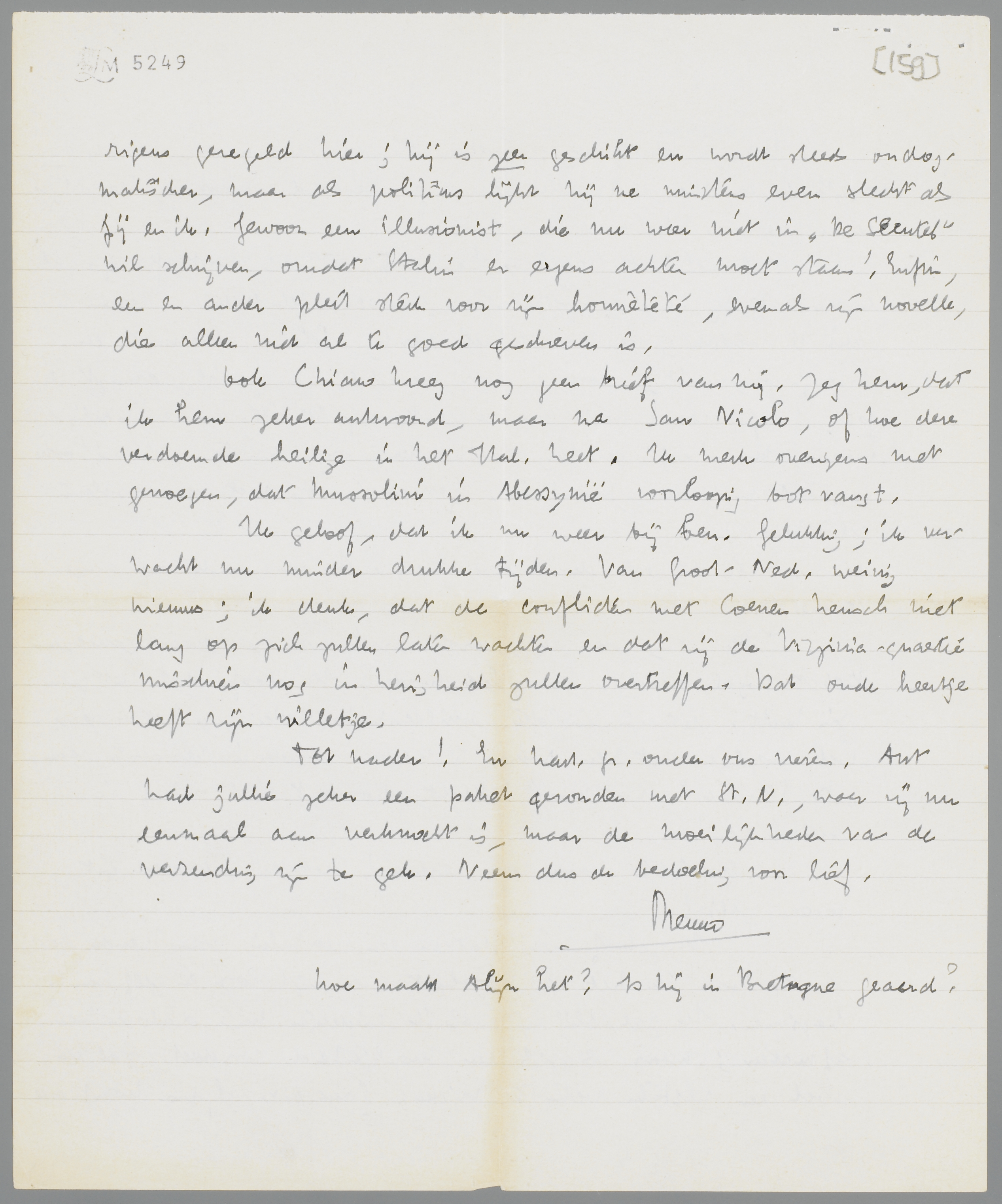 Ook Chiaro kreeg nog geen brief van mij. Zeg hem, dat ik hem zeker antwoord, maar na San Nicolo, of hoe deze verdoemde heilige in het Ital. heet. Ik merk overigens met genoegen, dat Mussolini in Abessynië voorloopig bot vangt.