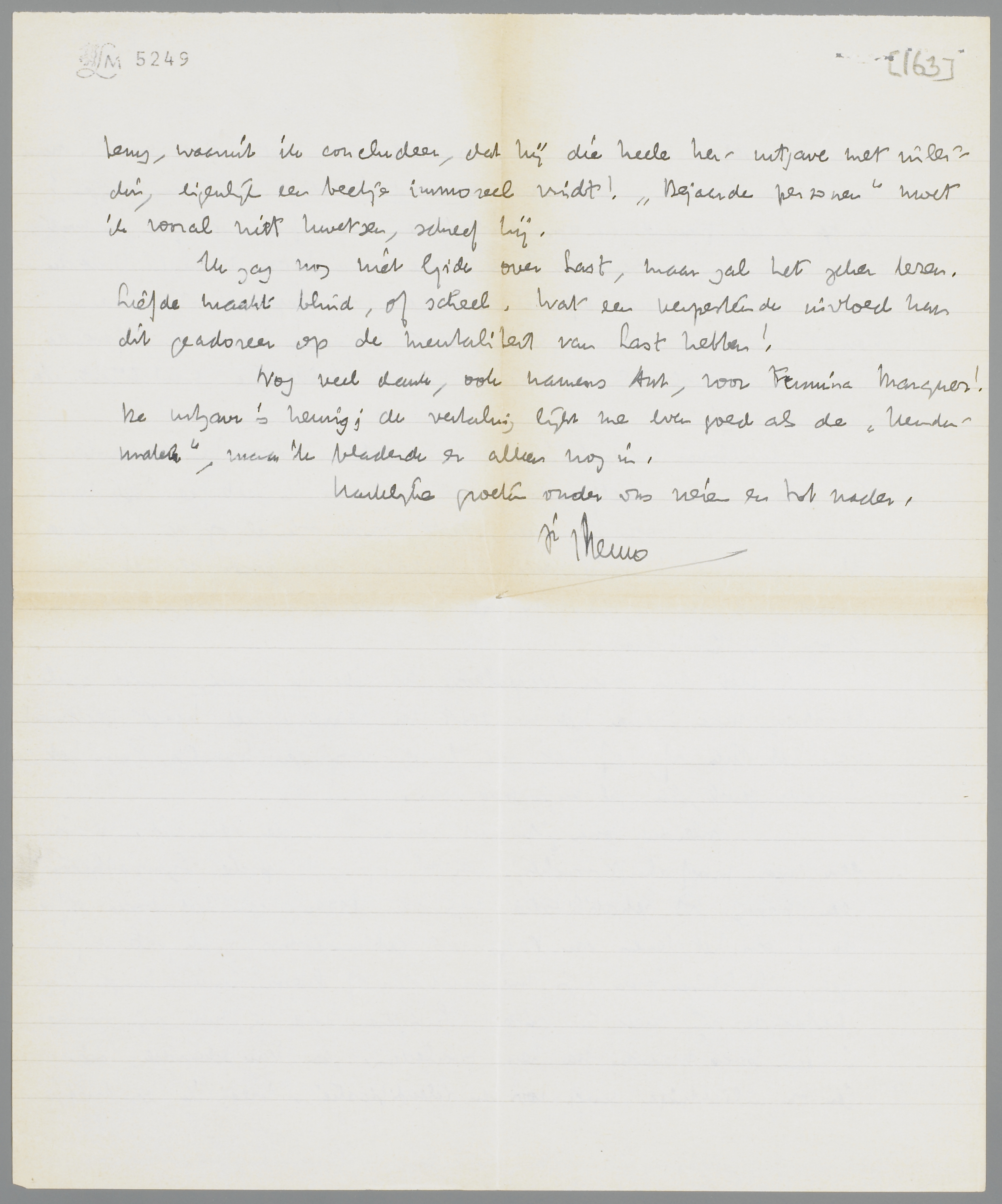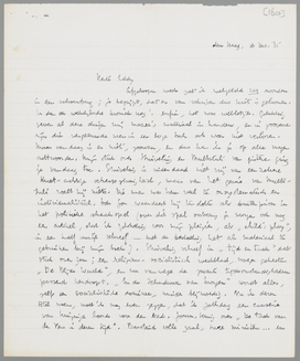 Ik bezit (om even in volgorde vragen te beantwoorden) niet de Denkende Vrouw van Carry v.B.; ik ben er niet zeker van, of het boek niet is uitverkocht. Sprokkelingen besprak ik al, in een vrij kort en weinig pregnant artikel (er was zeker een beter over te schrijven), als een tusschenproduct tusschen ‘Flaubert’ en ‘Nietzsche’; ik zal het je zenden, je zult er veel van den Haagschen heer en een weinig van een denker in vinden. Last moet ik nog bespreken, volgt dus later. Baanbrekertjes zijn mij niet gezonden; waarom dat verzuim? maar ik heb ze niet. Herhalingsoefeningen komen in hetzelfde pakje mee als Sprokkelingen, met Sankt Max. Maar kan ik den laatste in ieder geval voor a.s. Dinsdag weer terug krijgen? Ik ga in de paar dagen om Kerstmis en Nieuwjaar schrijven en moet o.a. Marx erbij hebben. De beide andere boeken hebben natuurlijk niet de minste haast! Ik doe bij het drukwerk voor Bep het stuk van mevr. Romein over Vrouw Jacob, dat bijzonder helder en afdoende is voor het geval als symptoom van de liederlijke mentaliteit hier onder de critici.